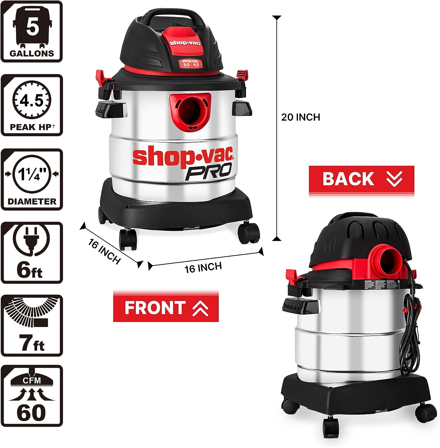 Shop-Vac 5 Gallon 4.5 Peak HP Wet/Dry Vacuum. Stainless Steel Tank. Portable Shop Vacuum with Filter. Hose and Accessories for Garage. Workshop. 5920588
