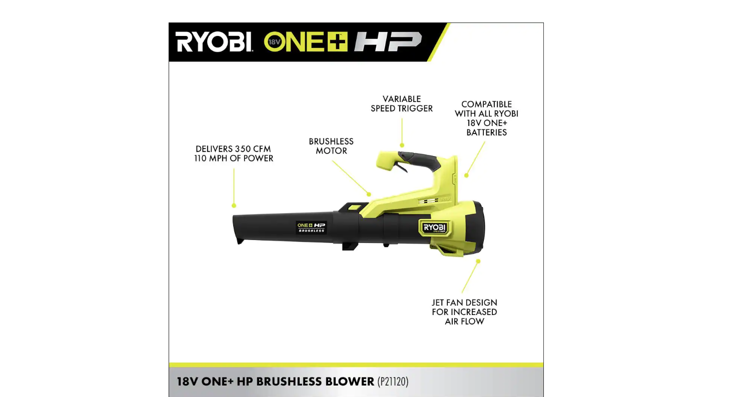 RYOBI P21012BTLVNM ONE+ HP 18V Brushless 110 MPH 350 CFM Cordless Variable-Speed Jet Fan Leaf Blower (Tool Only)