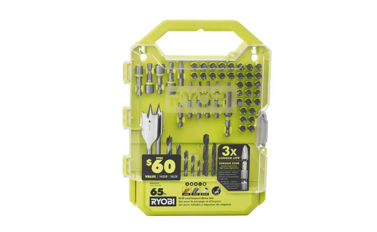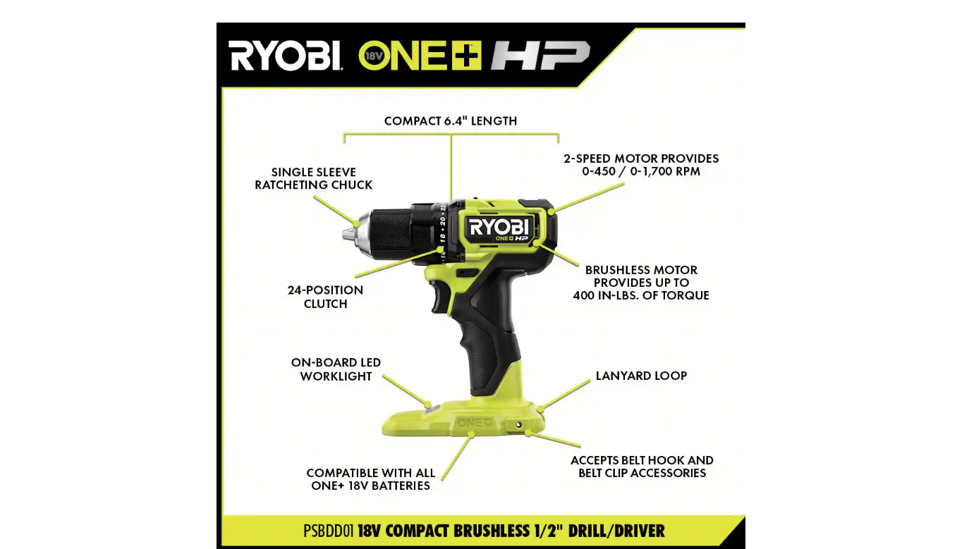 RYOBI PSBDD01K-A986501 ONE+ HP 18V Brushless Cordless Compact 1/2 in. Drill/Driver Kit with (2) 1.5 Ah Batteries. Charger. Bag. & 65PC Bit Set