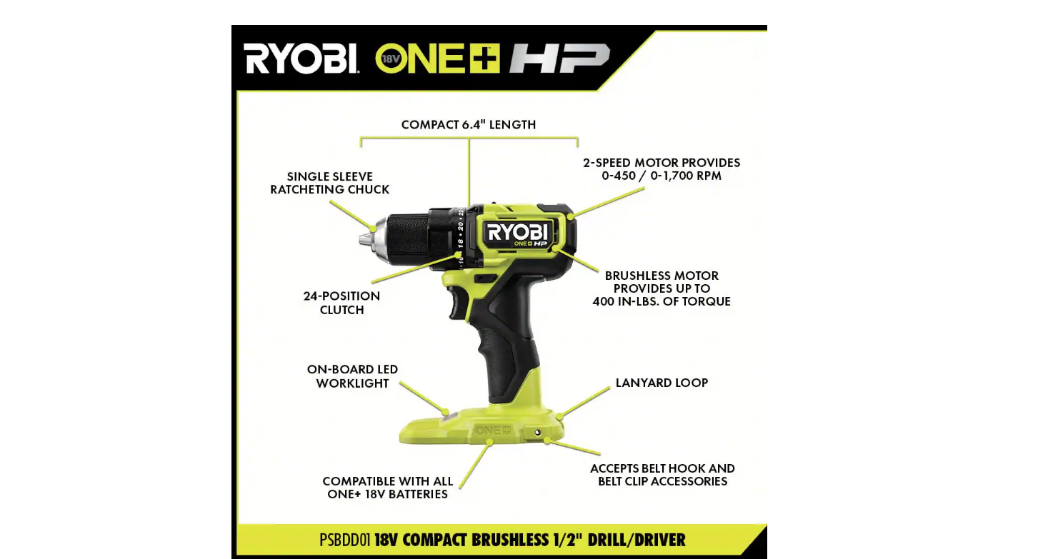 RYOBI PSBDD01K-PSBRS01B-PSBIW01B ONE+ HP 18V Brushless Cordless Compact 1/2 in. Drill/Driver. One-Handed Reciprocating Saw. Impact Wrench. (2) Batteries. Charger