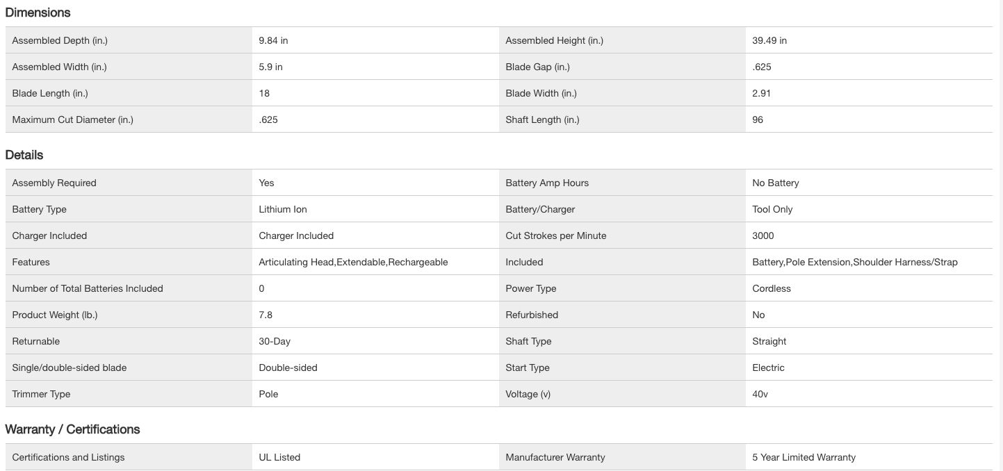RYOBI RY40603BTL 40V 18 in. Cordless Battery Pole Hedge Trimmer (Tool-Only)