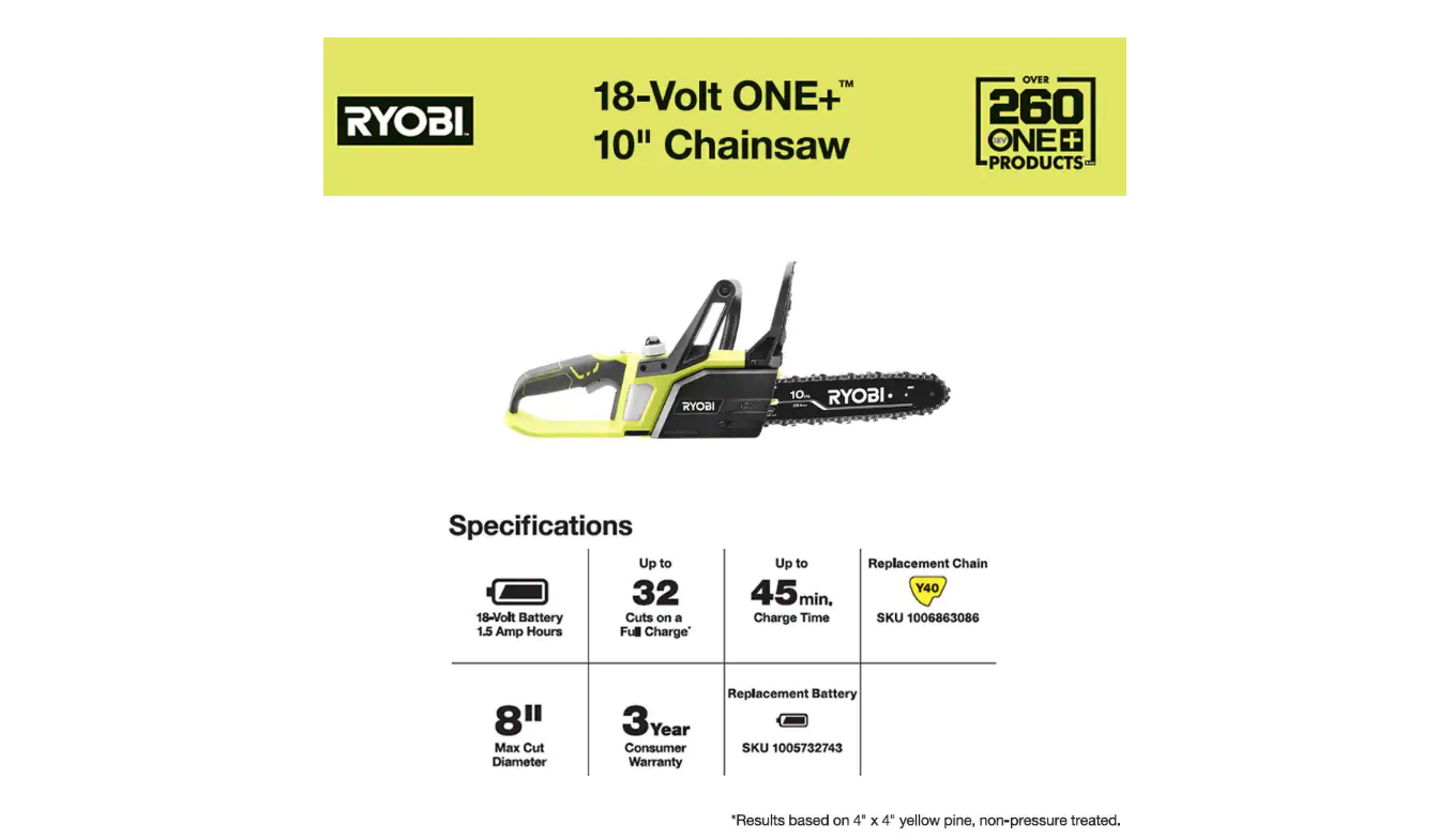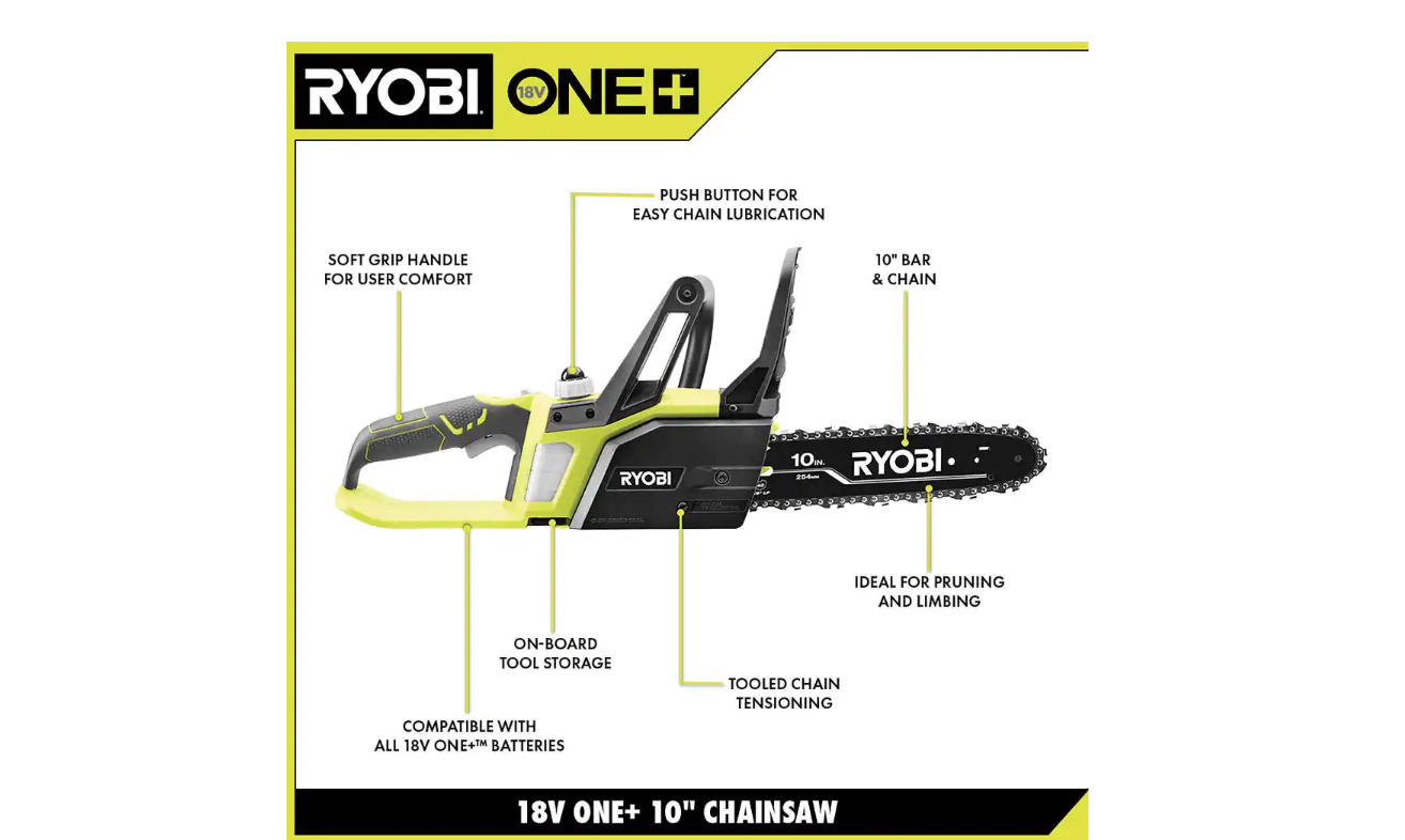 RYOBI P547 ONE+ 18V 10 in. Cordless Battery Chainsaw with 1.5 Ah Battery and Charger