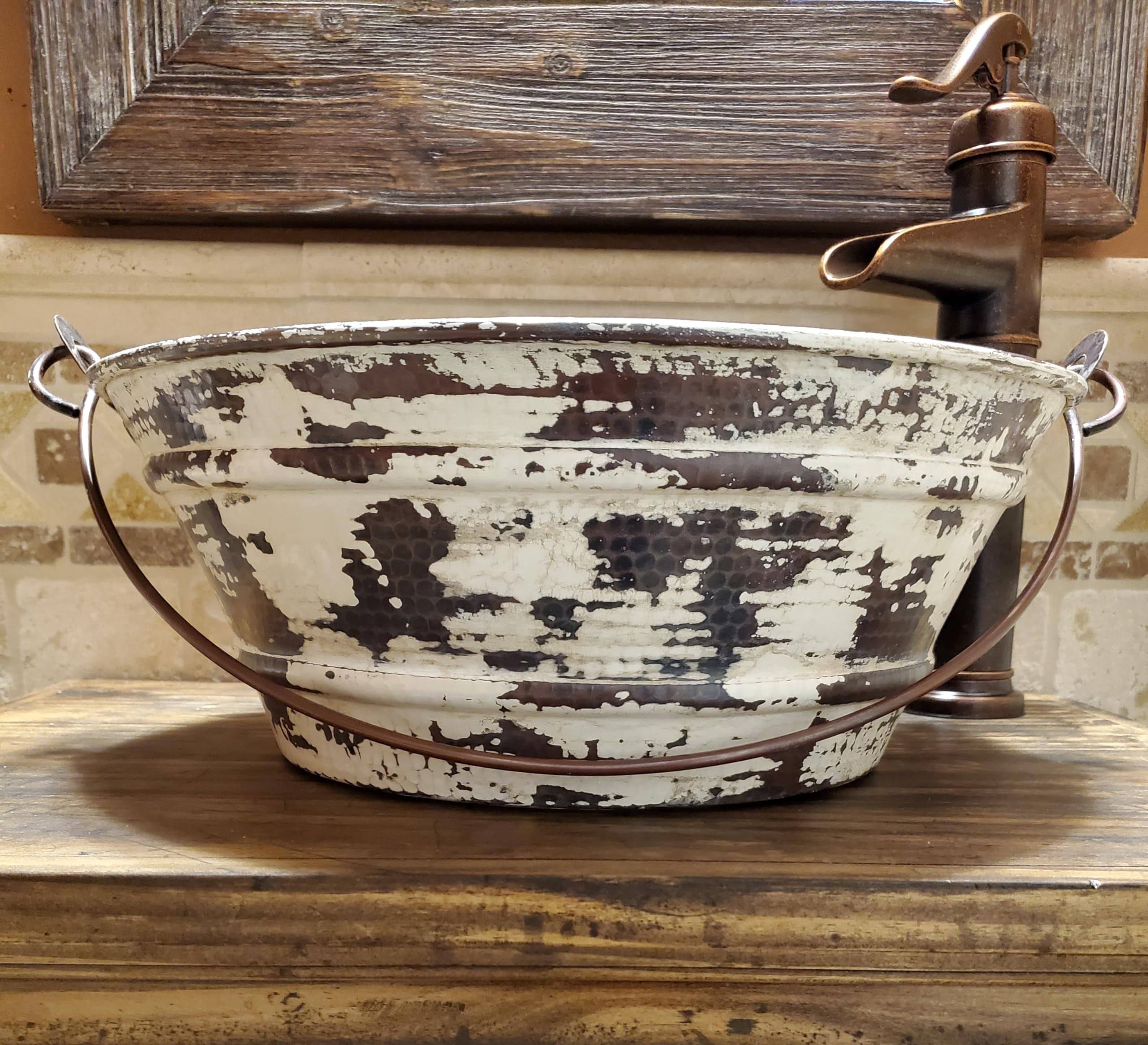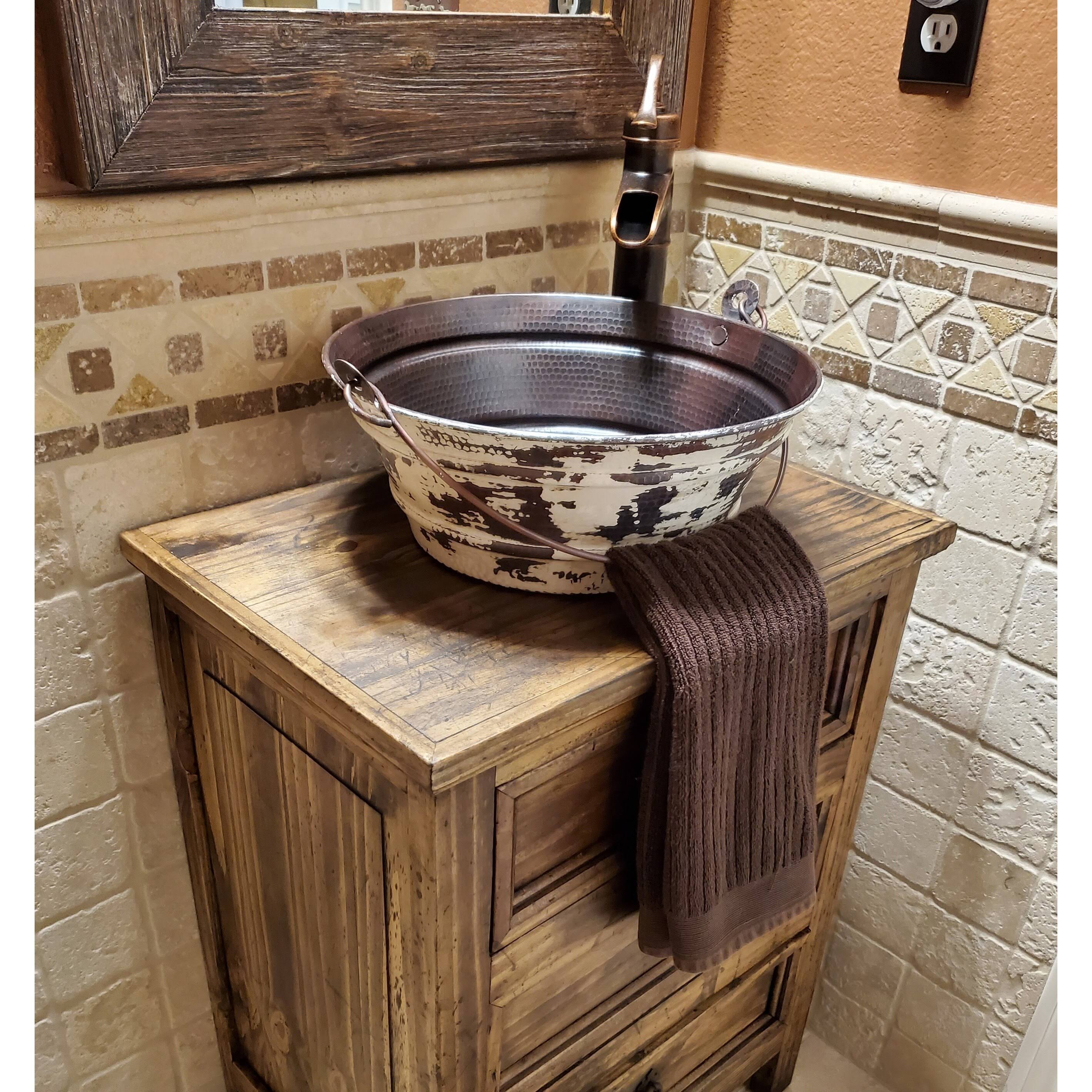 SimplyCopper 15" Round Copper Bucket Vessel Bathroom Sink in Antique White Exterior- 15" x 15" x 6"
