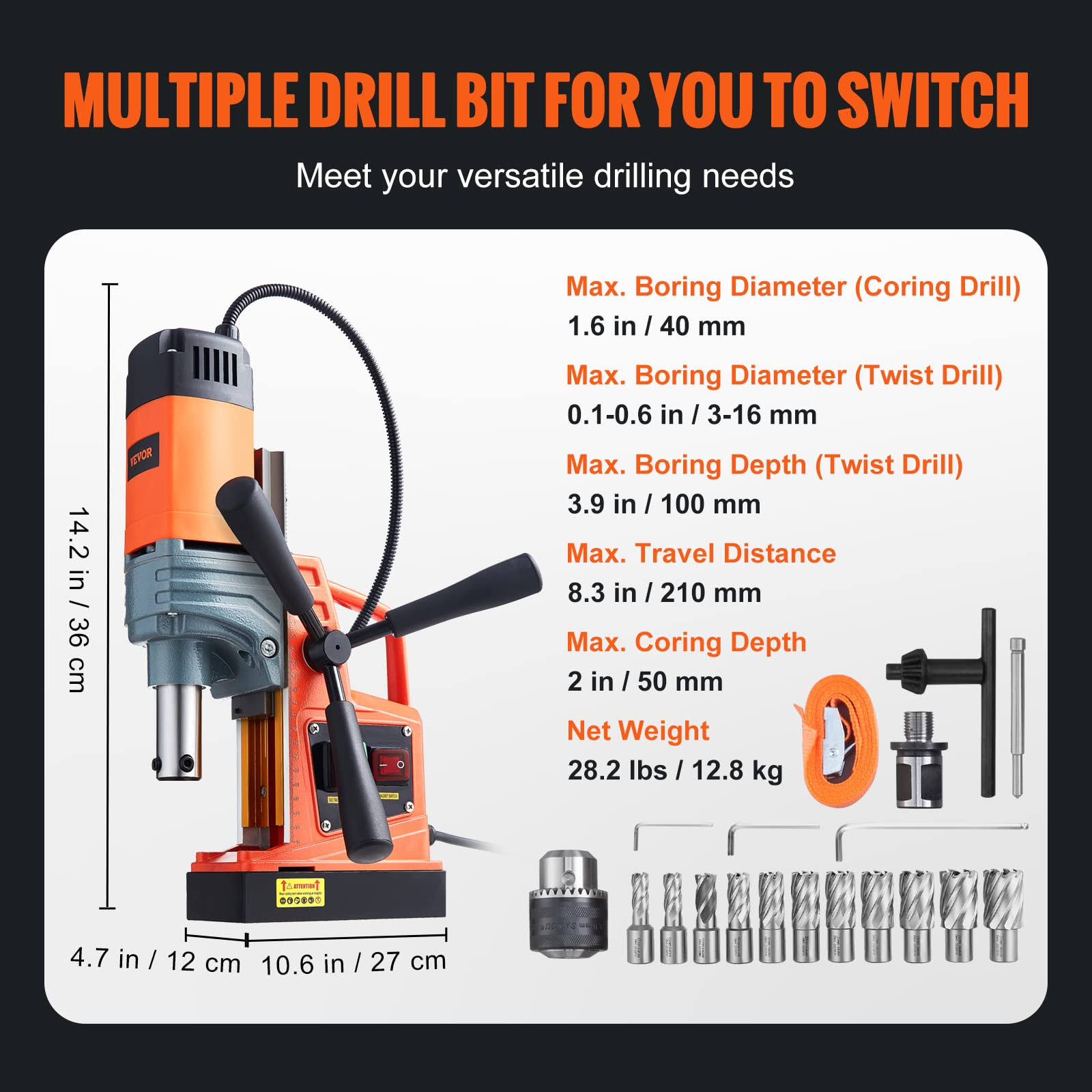 VEVOR Mag Drill Press, 1.6" Boring Diameter, 2922lbf Power Magnetic Drill with Twist Drill Chuck, 11pcs Drill Bits, Magnetic Drill Press for Metal
