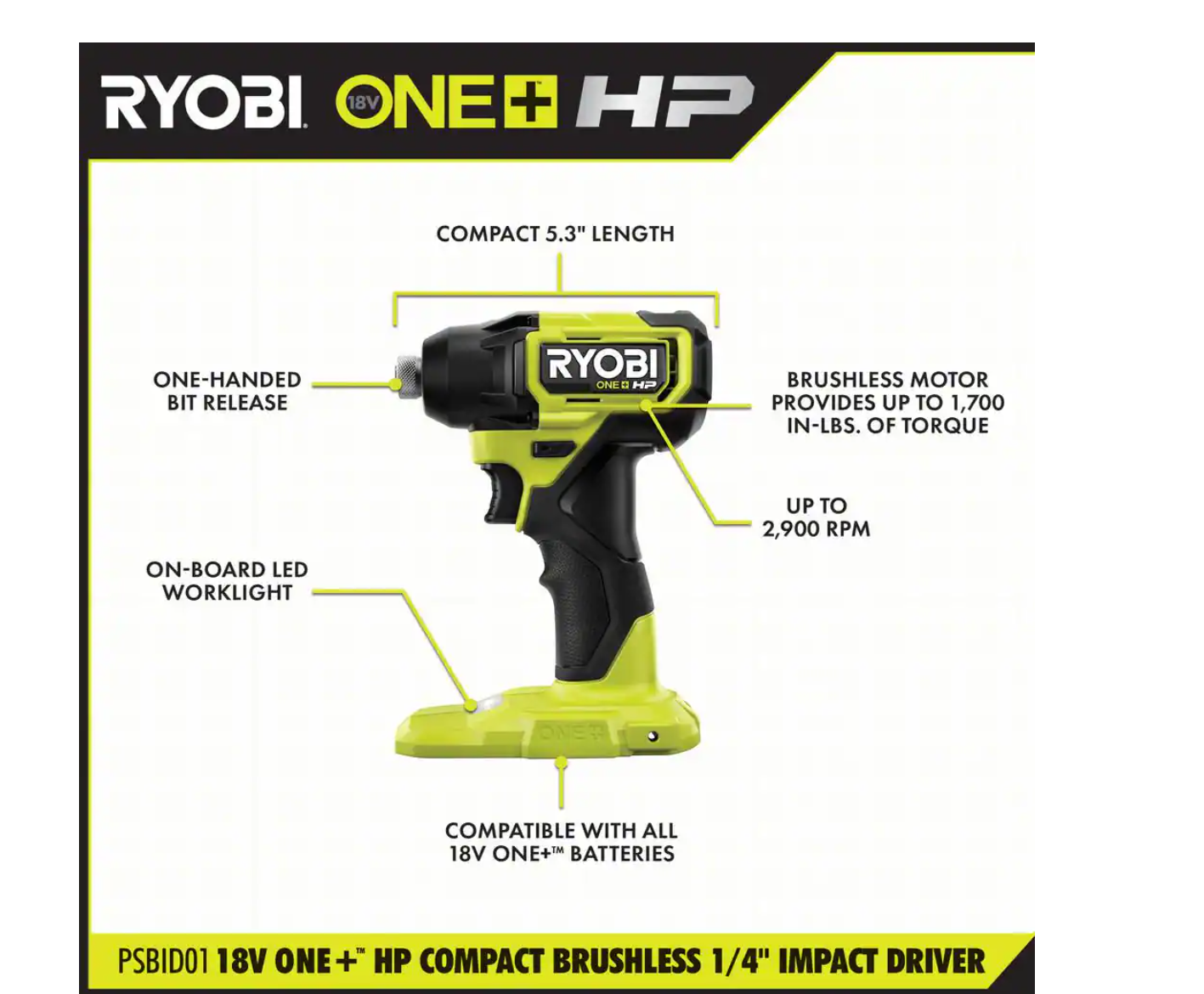 RYOBI PSBID01K ONE+ HP 18V Brushless Cordless Compact 1/4 in. Impact Driver Kit with (2) 1.5 Ah Batteries. Charger and Bag