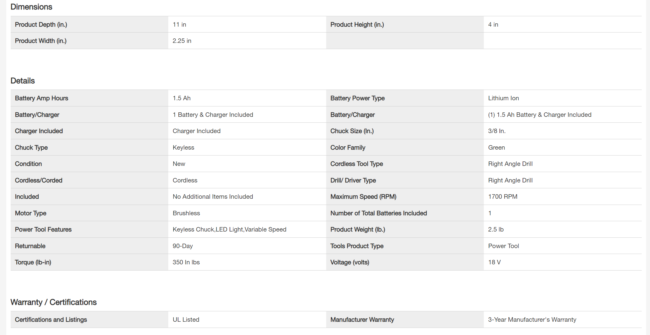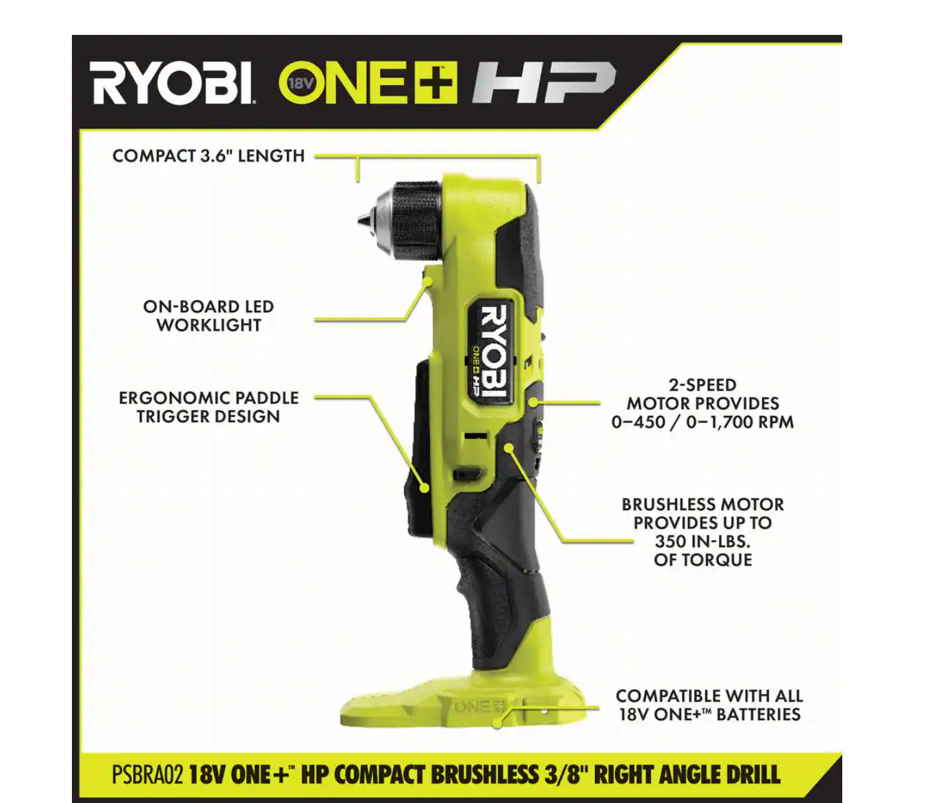 RYOBI PSBRA02K ONE+ HP 18V Brushless Cordless Compact 3/8 in. Right Angle Drill Kit with (1) 1.5 Ah Battery and 18V Charger