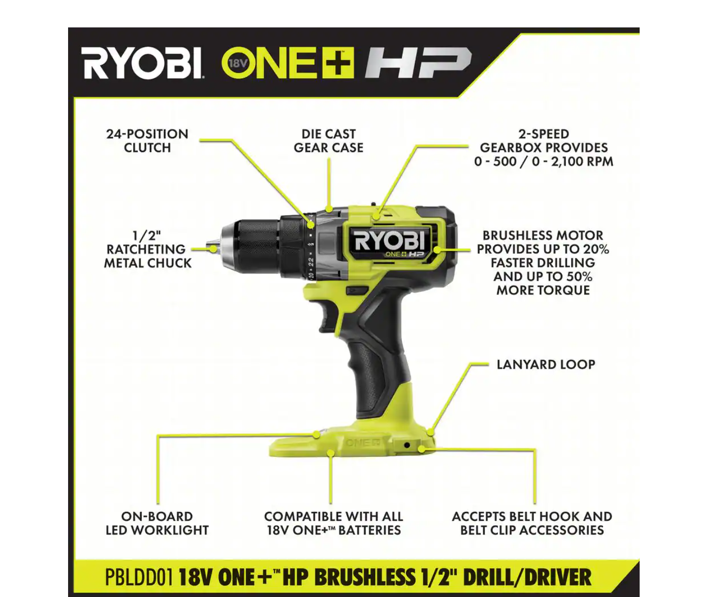 RYOBI PBLDD01K ONE+ HP 18V Brushless Cordless 1/2 in. Drill/Driver Kit with (2) 2.0 Ah HIGH PERFORMANCE Batteries. Charger. and Bag