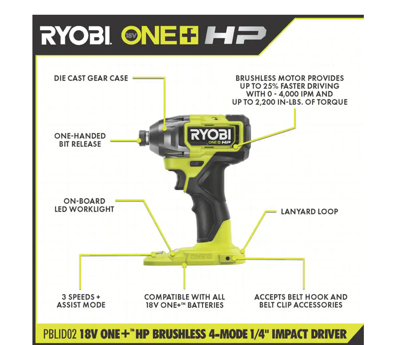 RYOBI PBLID02B ONE+ HP 18V Brushless Cordless 1/4 in. 4-Mode Impact Driver (Tool Only)