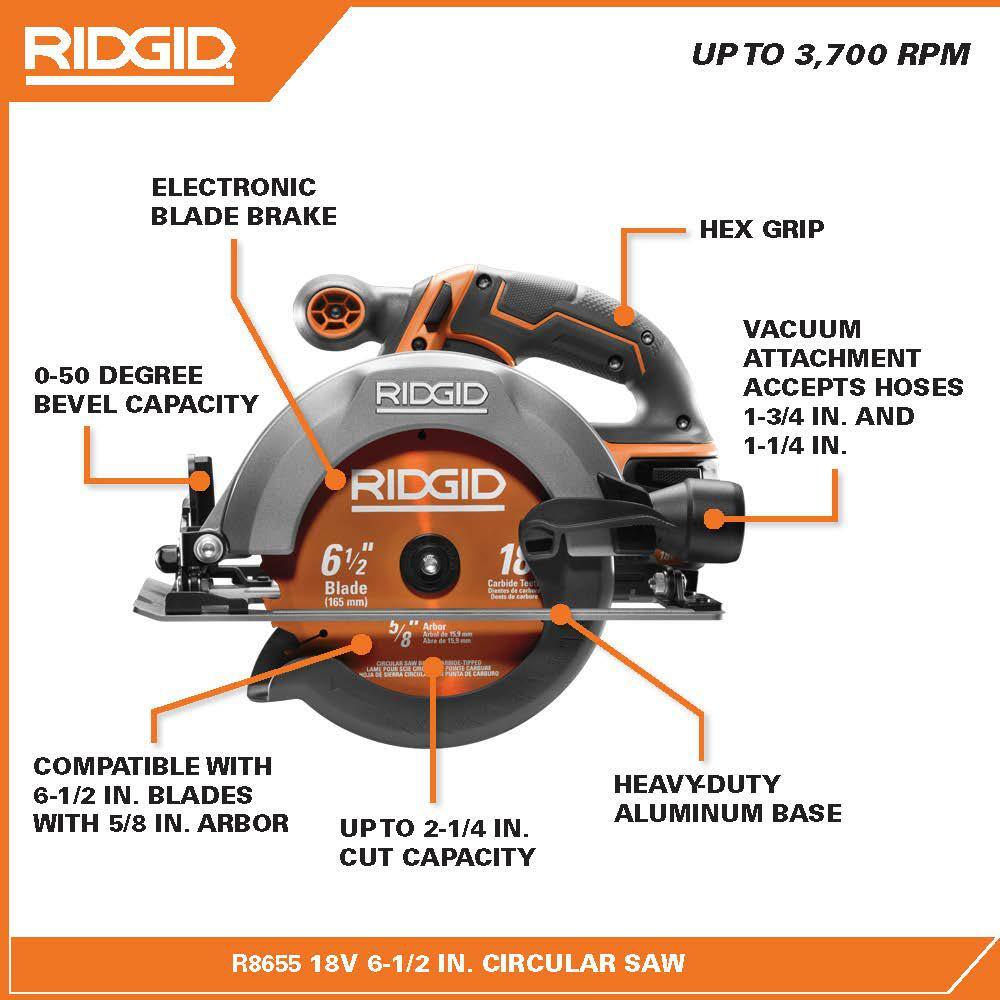 RIDGID R8655B-AC93044SBN 18V Cordless 6-1/2 in. Circular Saw with (2) 4.0 Ah Batteries. 18V Charger. and Bag