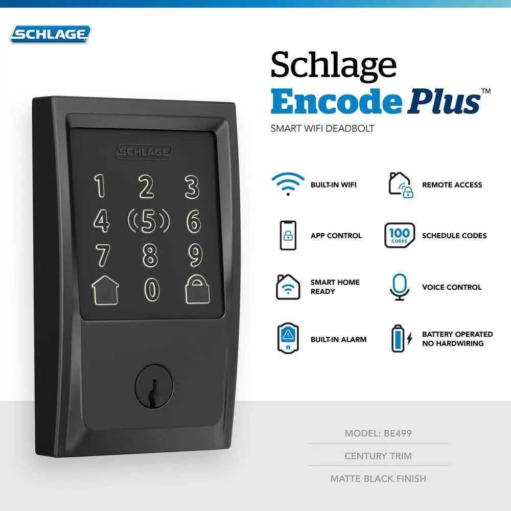 Schlage Be499cen622 Encode Plus Smart WiFi Century Trim Deadbolt, Matte Black