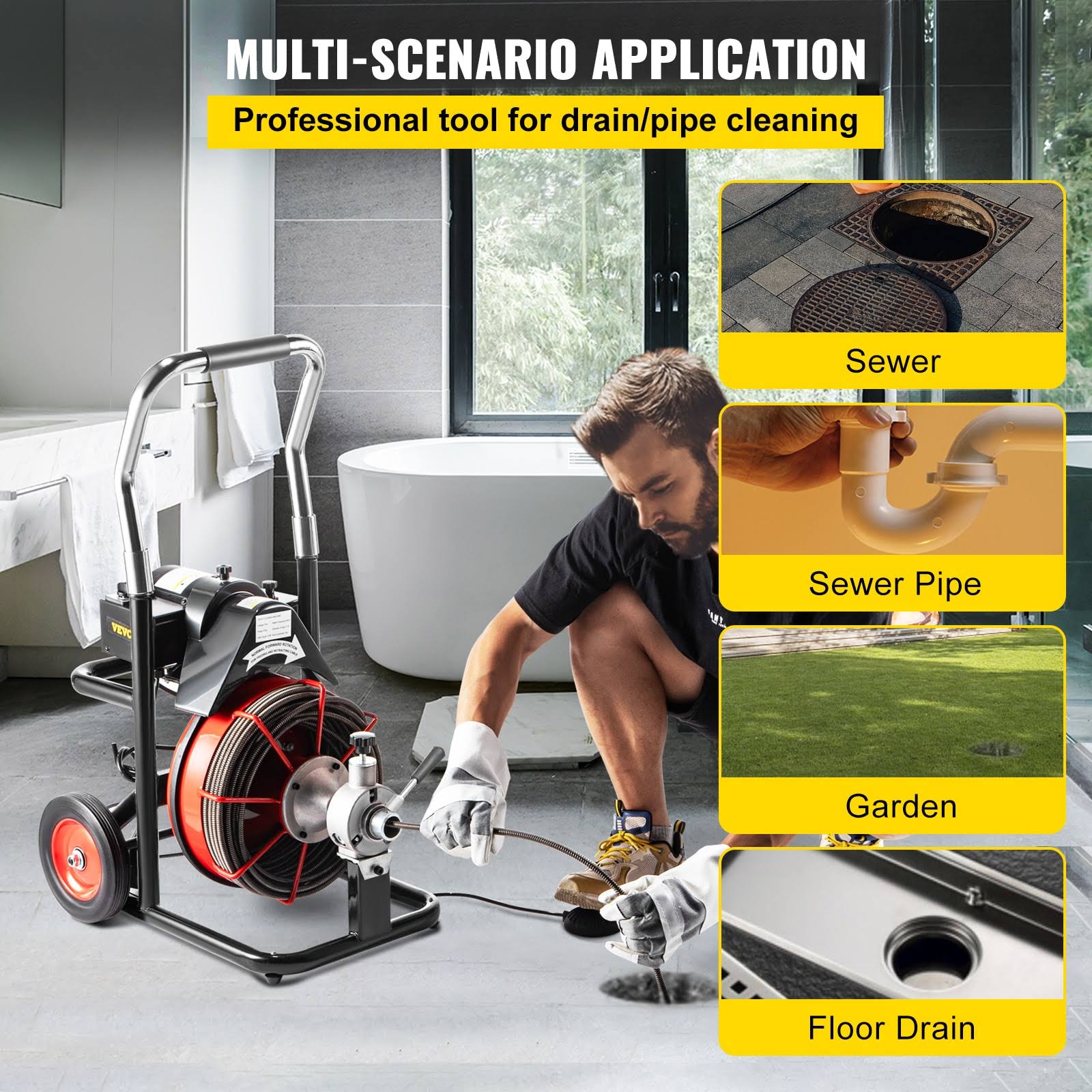 VEVOR Electric Drain Auger 100 ft. x 3/8 in. Portable Sewer Clean Snake 370-Watt with Cutters Glove for 1 in. to 4 in. Pipe