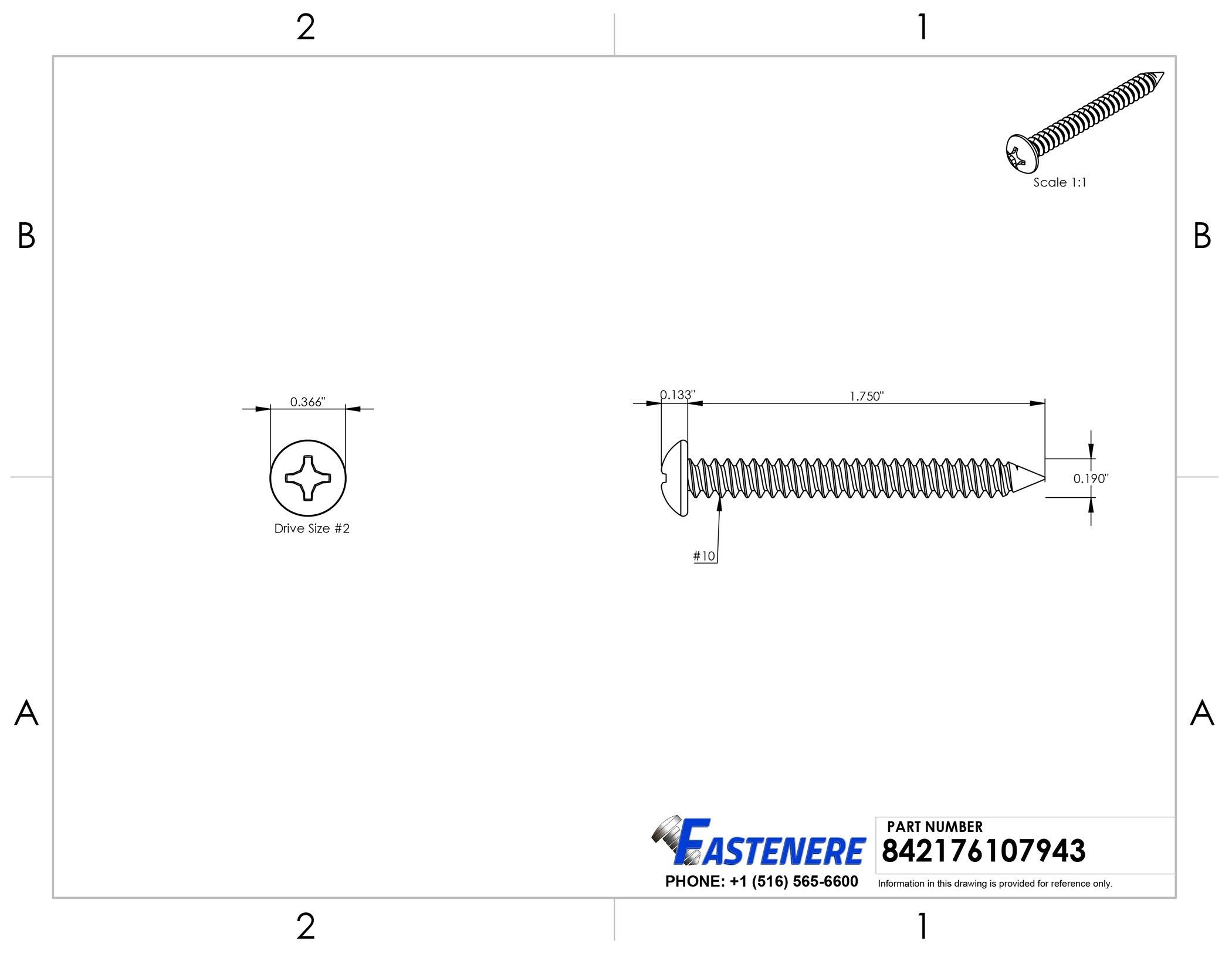 #10 x 1-3/4" Pan Head Sheet Metal Screws, Full Thread, Phillips Drive, Stainless Steel 18-8, Bright Finish, Self-Tapping, Quantity 50 Pieces