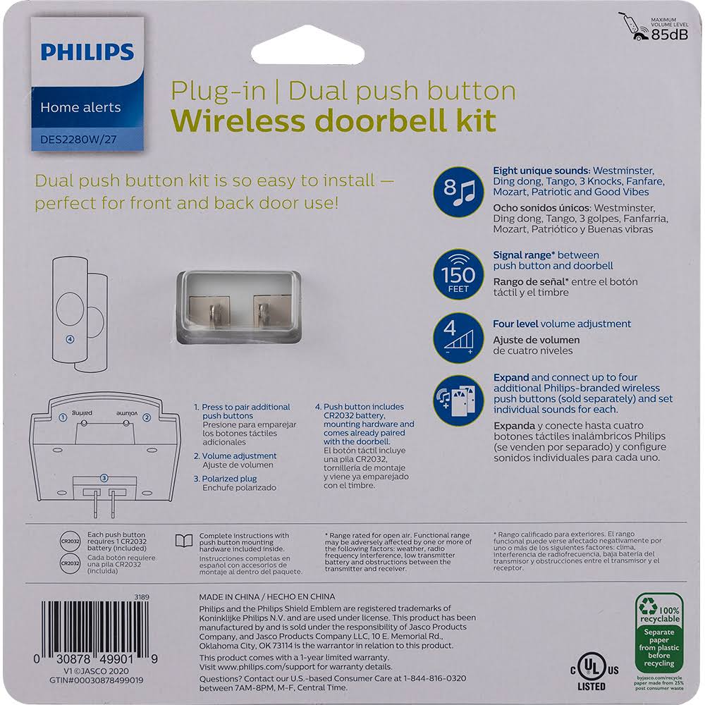 Philips Plug-In 8-Melody Doorbell Kit, White, 2-Push Buttons �C DES2280W/27