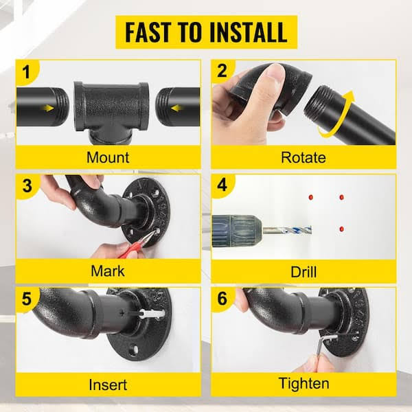 VEVOR Pipe Stair Handrail, 11ft Staircase Handrail, 440lbs Load Capacity Carbon Steel Pipe Handrail, Industrial Pipe Handrail with Wall Mount