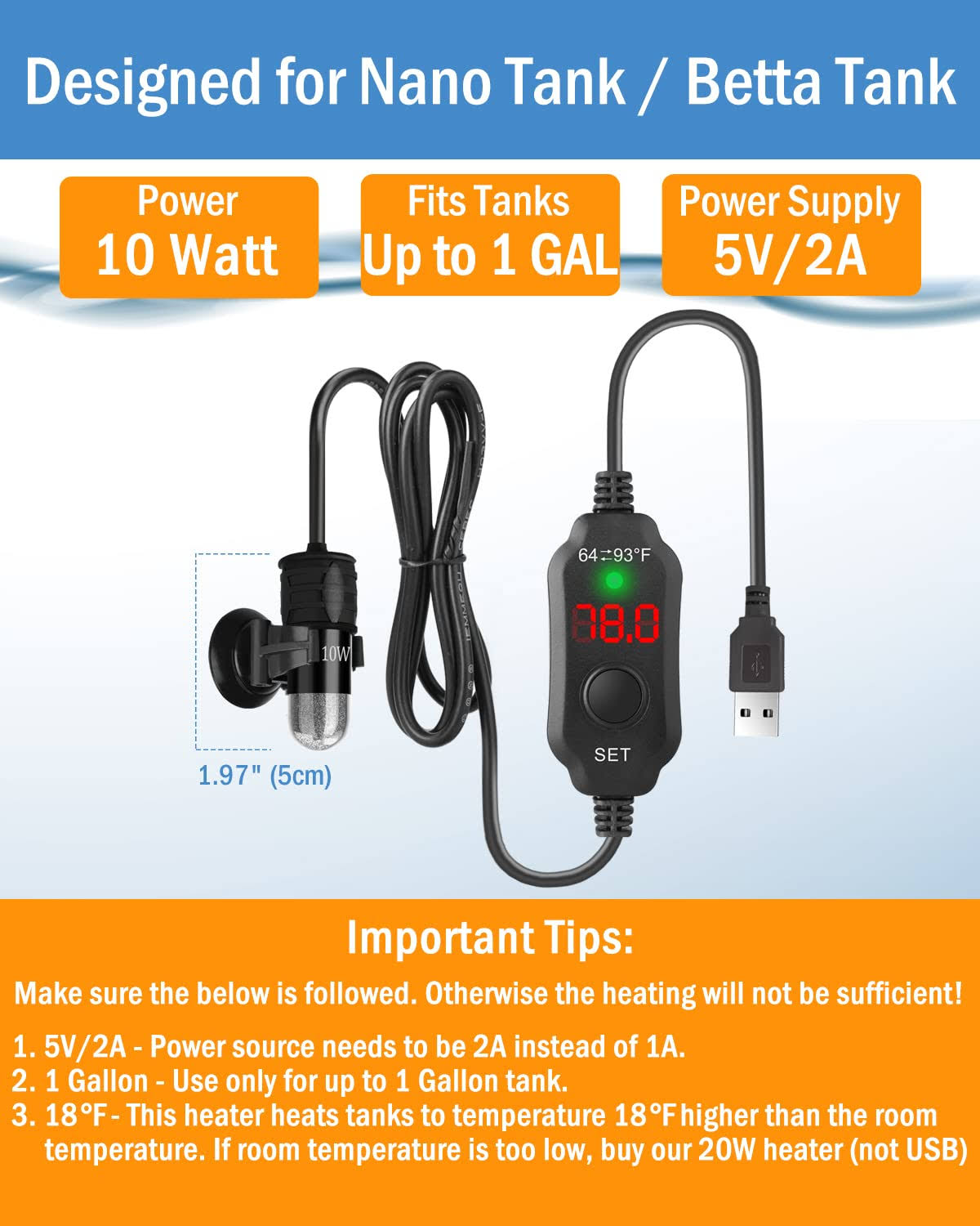 AquaMiracle Adjustable 10W Betta Heater Small Aquarium Heater Submersible Fish Tank Heater 5V/2A USB Powered Super Mini Aquarium Heater with Digital
