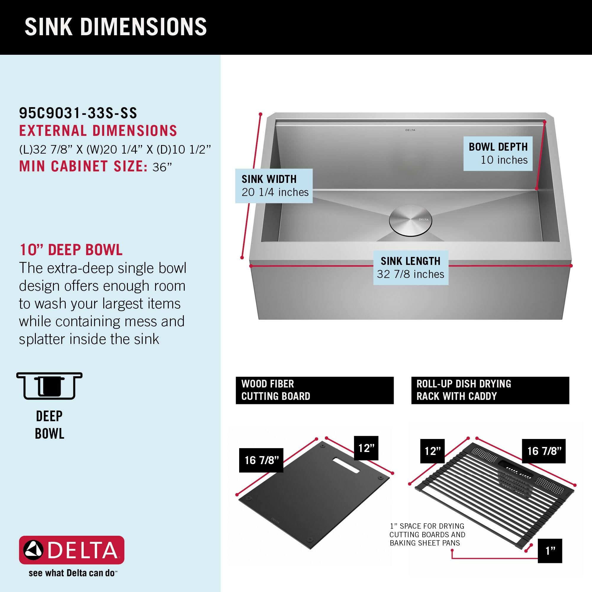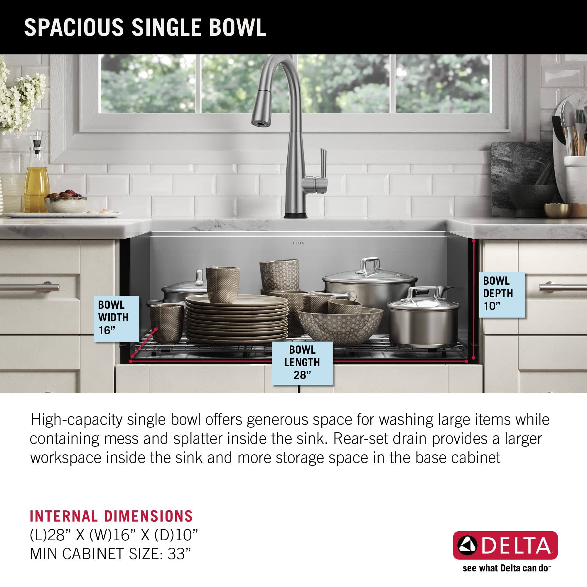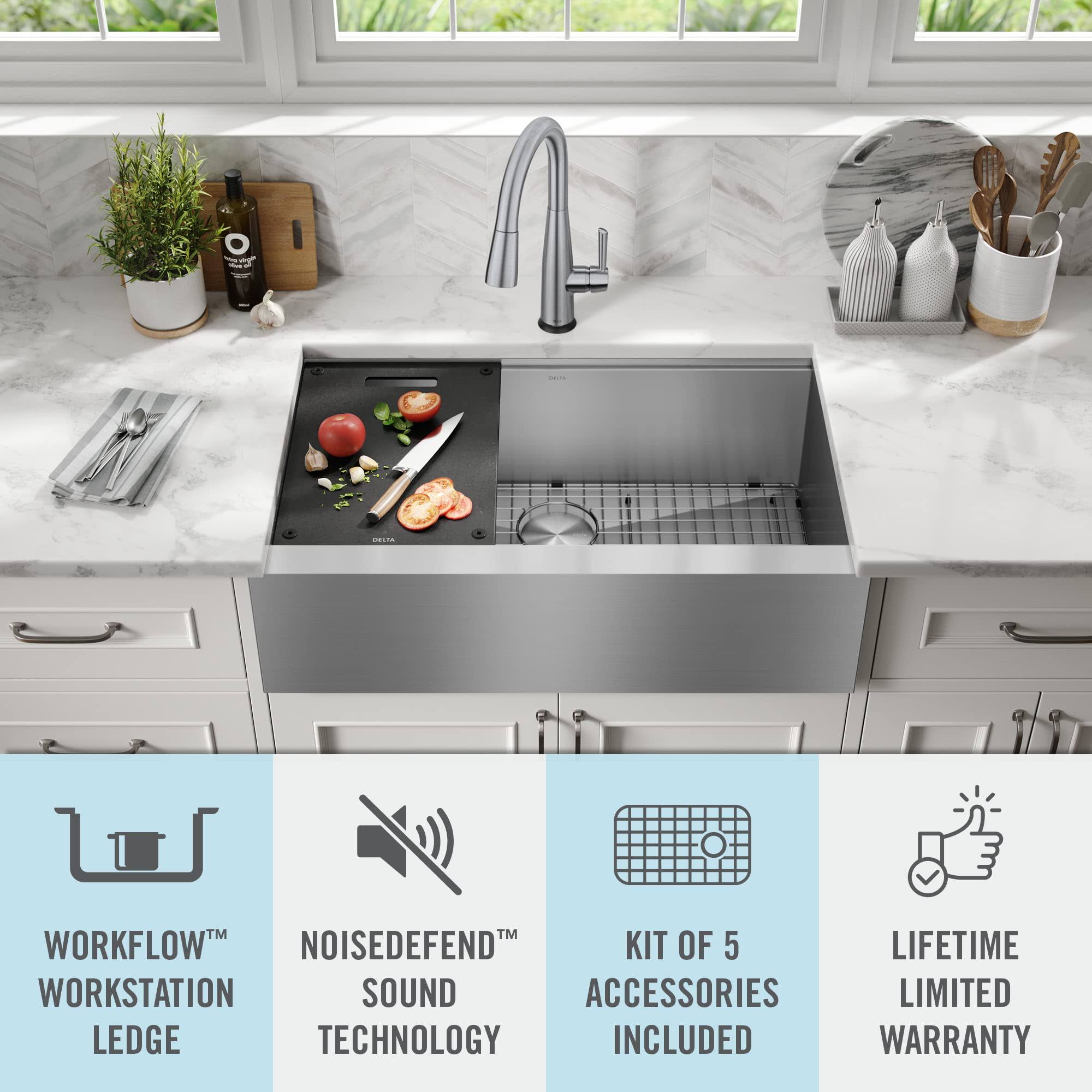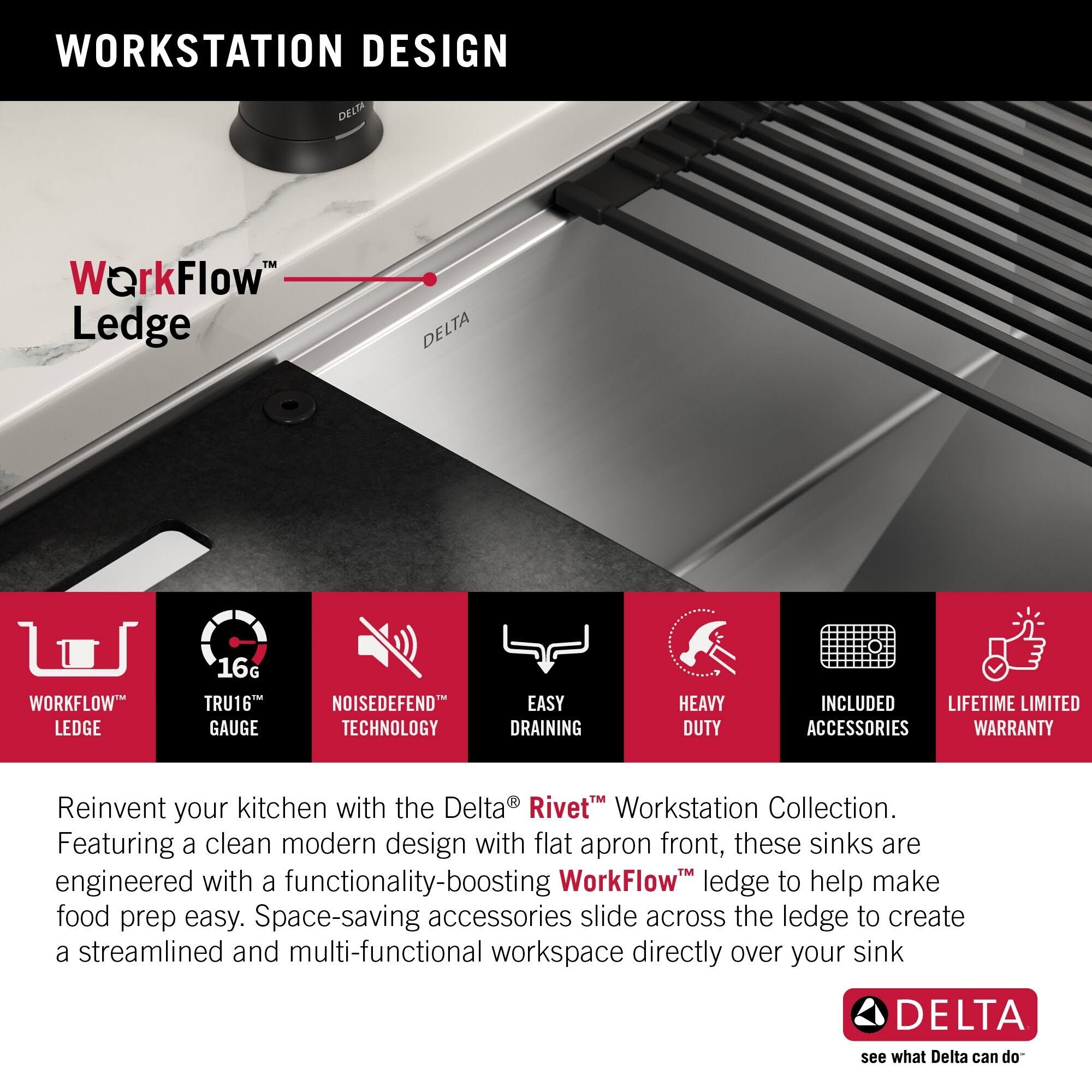 Delta 95C9031-33S-SS Rivet 33" L Workstation Farmhouse Apron Front Kitchen Sink Undermount 16 Gauge Stainless Steel Single Bowl