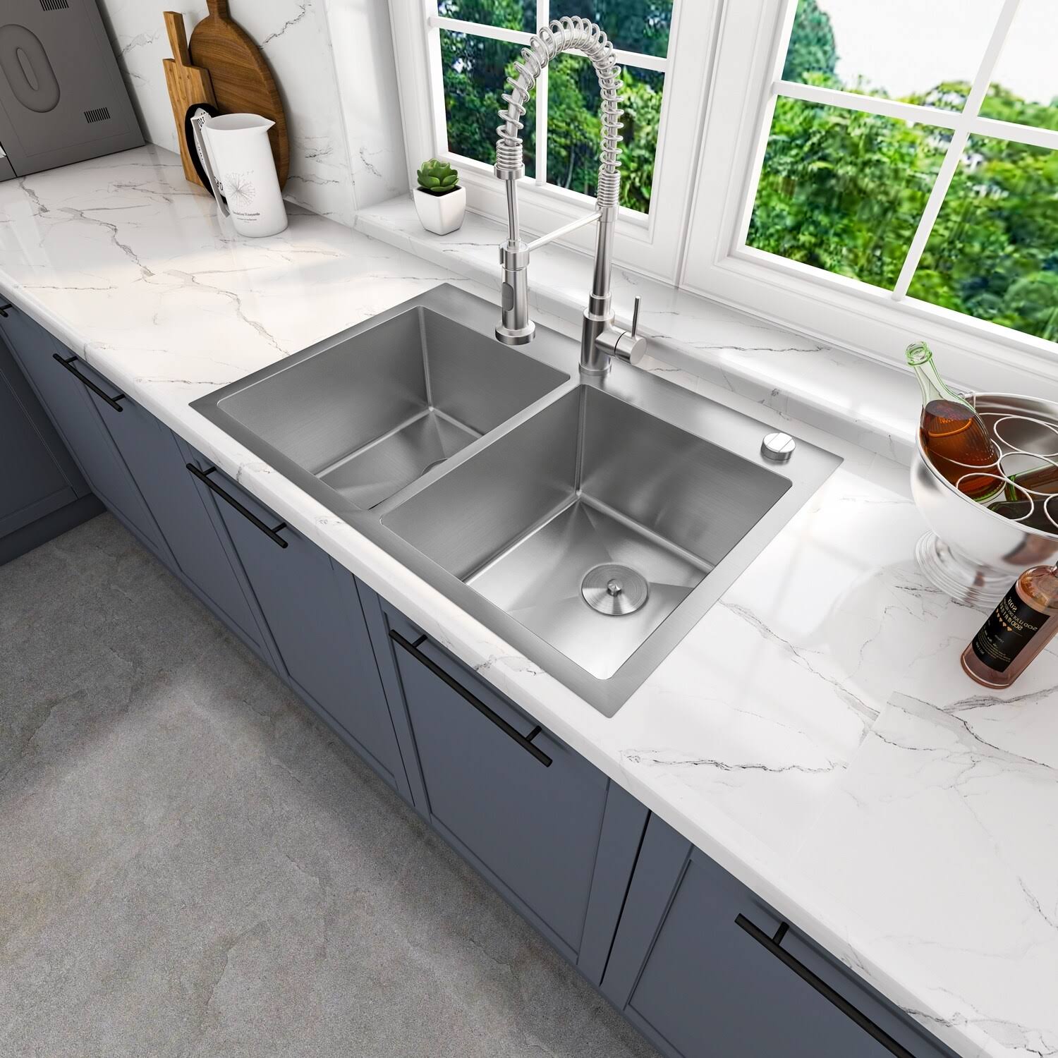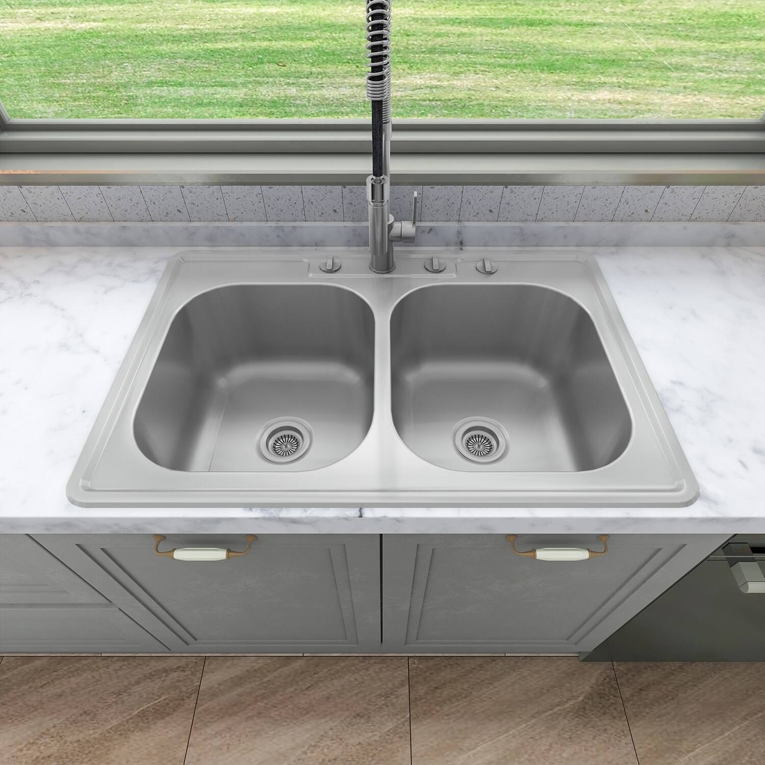Sinber 304 Stainless Steel 18 Gauge 33 in. Double Bowl Drop-In Kitchen Sink, Silver