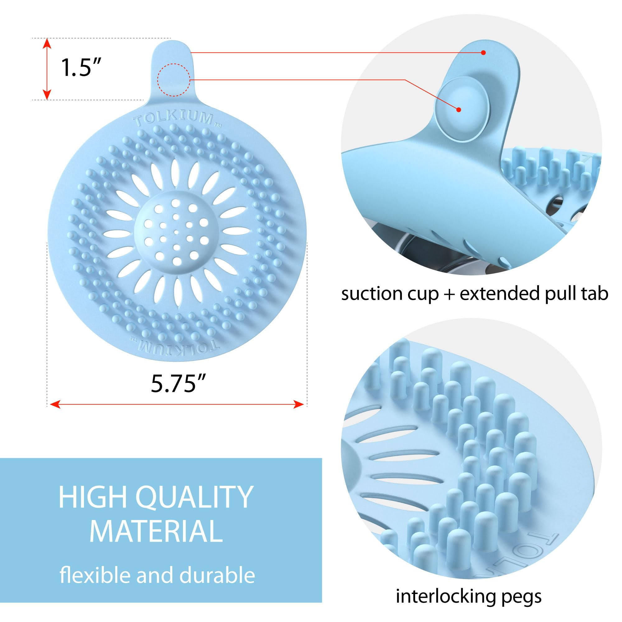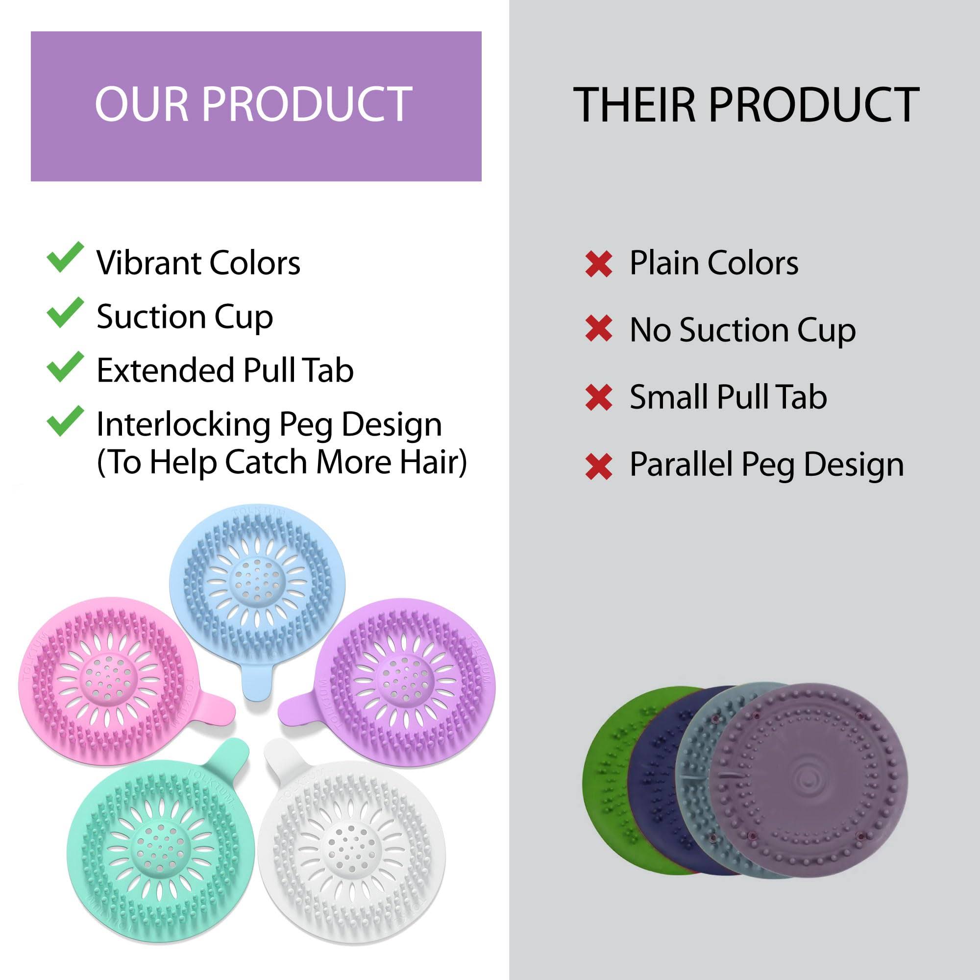 TOLKIUM Vibrant Drain Hair Catcher 5-Pack- Durable Silicone Like Shower Drain Cover Hair Catcher for Bath, Sink, Shower, and Bathtub- Home