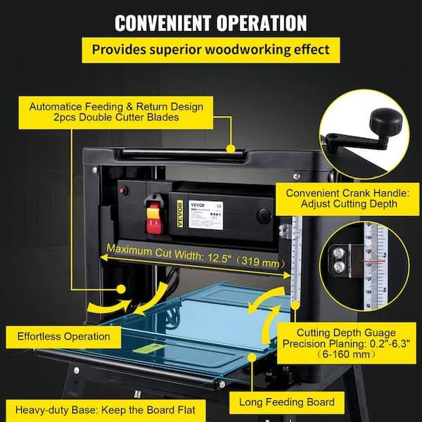 VEVOR Thickness Planer 12-1/2 in. Wood Planer Foldable 1500-Watts with Dust Exhaust Interface Stand for Woodworking, Black