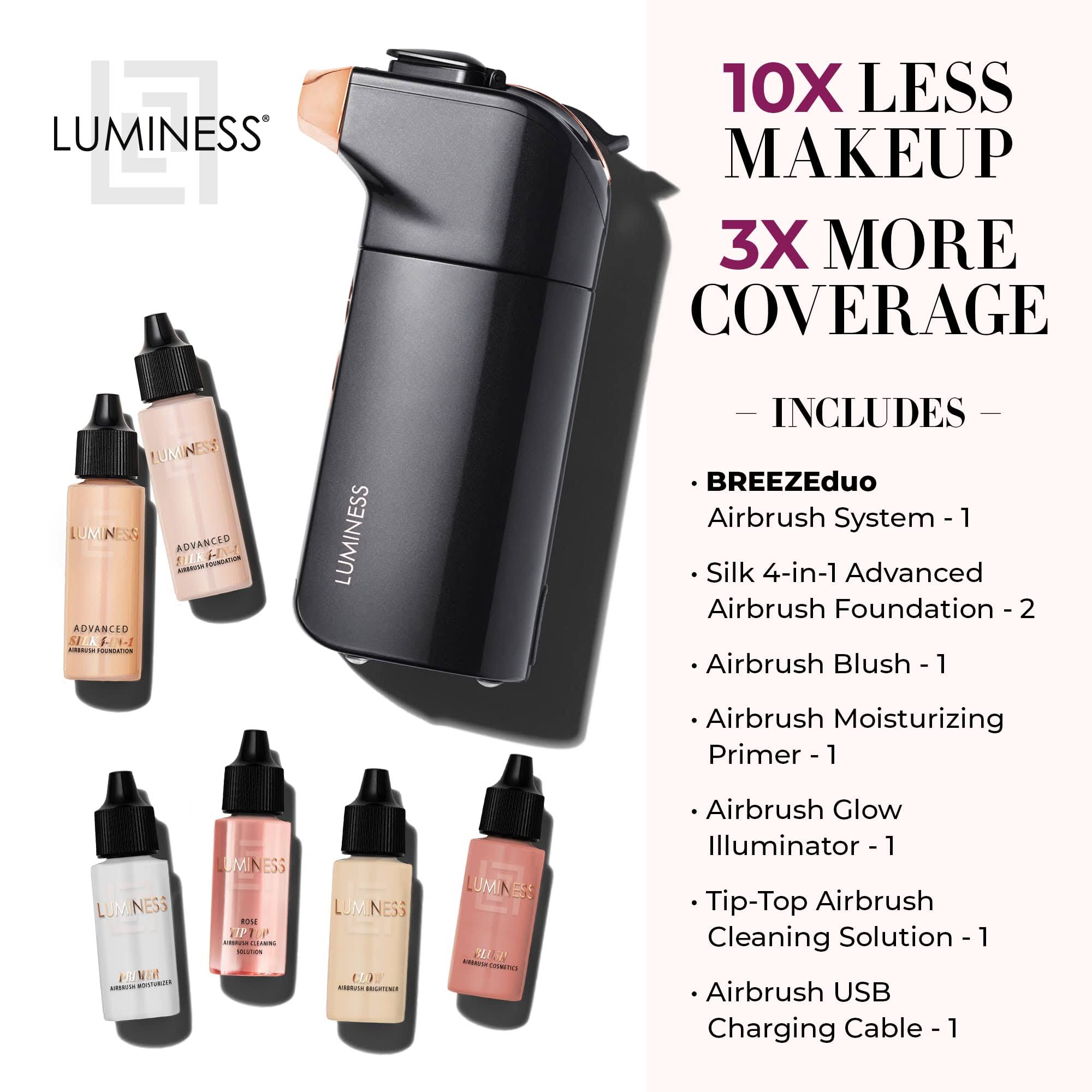 Luminess Breeze Duo Airbrush Makeup System, Medium Coverage- 9-Piece Kit Includes 2x Silk Airbrush Foundation, Soft Rose Blush, Glow Highlighter, Moi