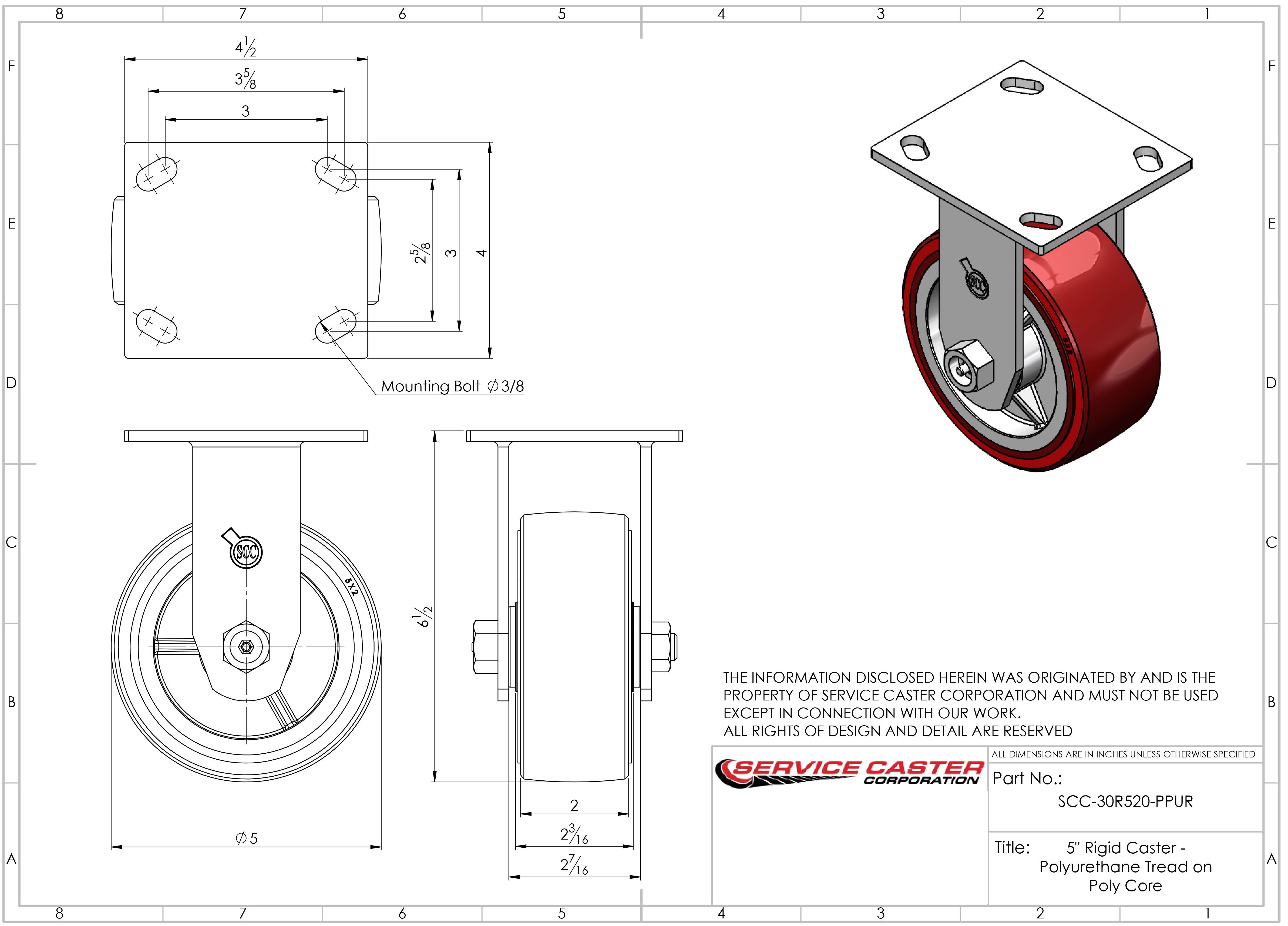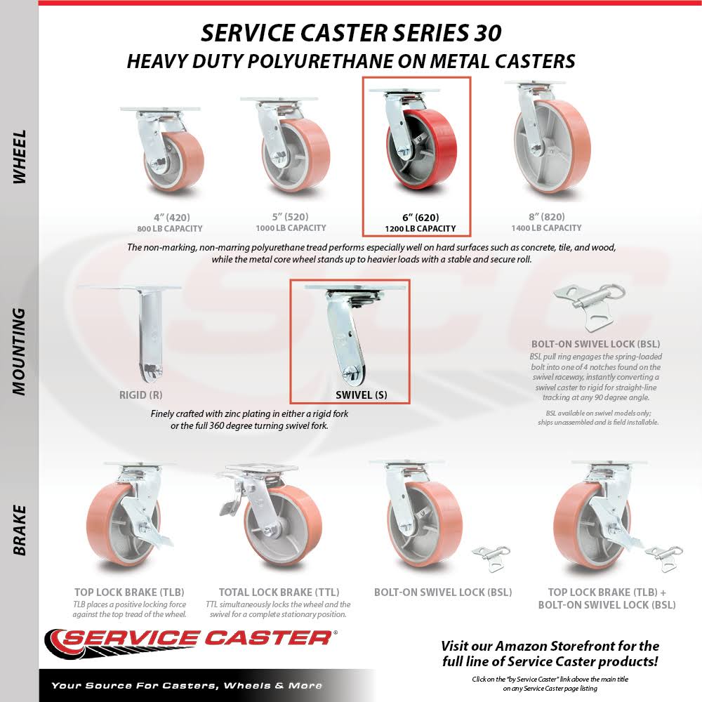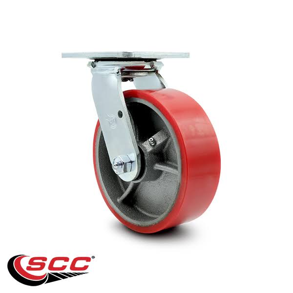Polyurethane on Cast Iron Swivel Top Plate Caster w/6" x 2" Red Wheel- 1200 lbs Capacity/Caster- Service Caster Brand
