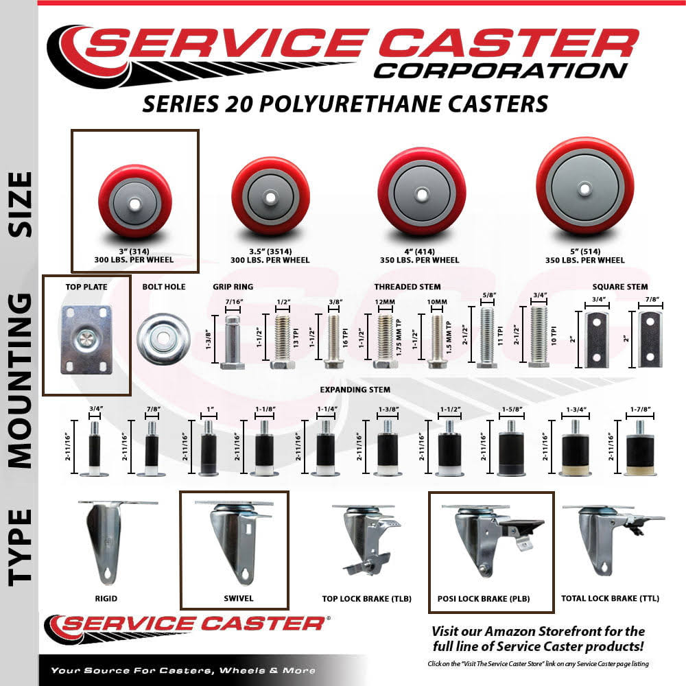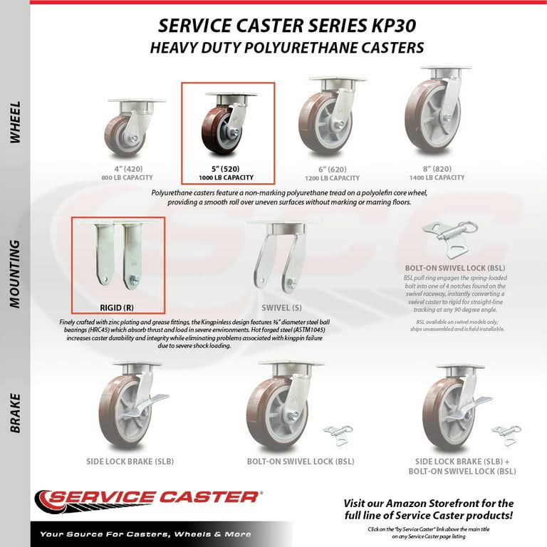 Service Caster- 5" Heavy Duty Polyurethane Wheel Caster Set of 4- with 2 Rigid/2 Swivel w/Top Lock