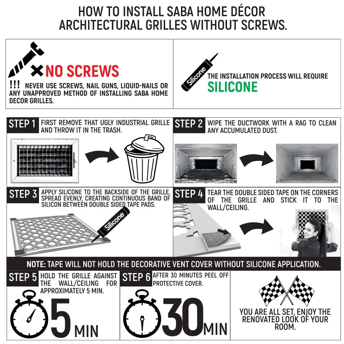 Saba Home Decor, Air Vent Cover Grille- Acrylic Fiberglass 6" x 10" Duct Opening (8" x 12" Overall) White Finish Decorative Register Covers for