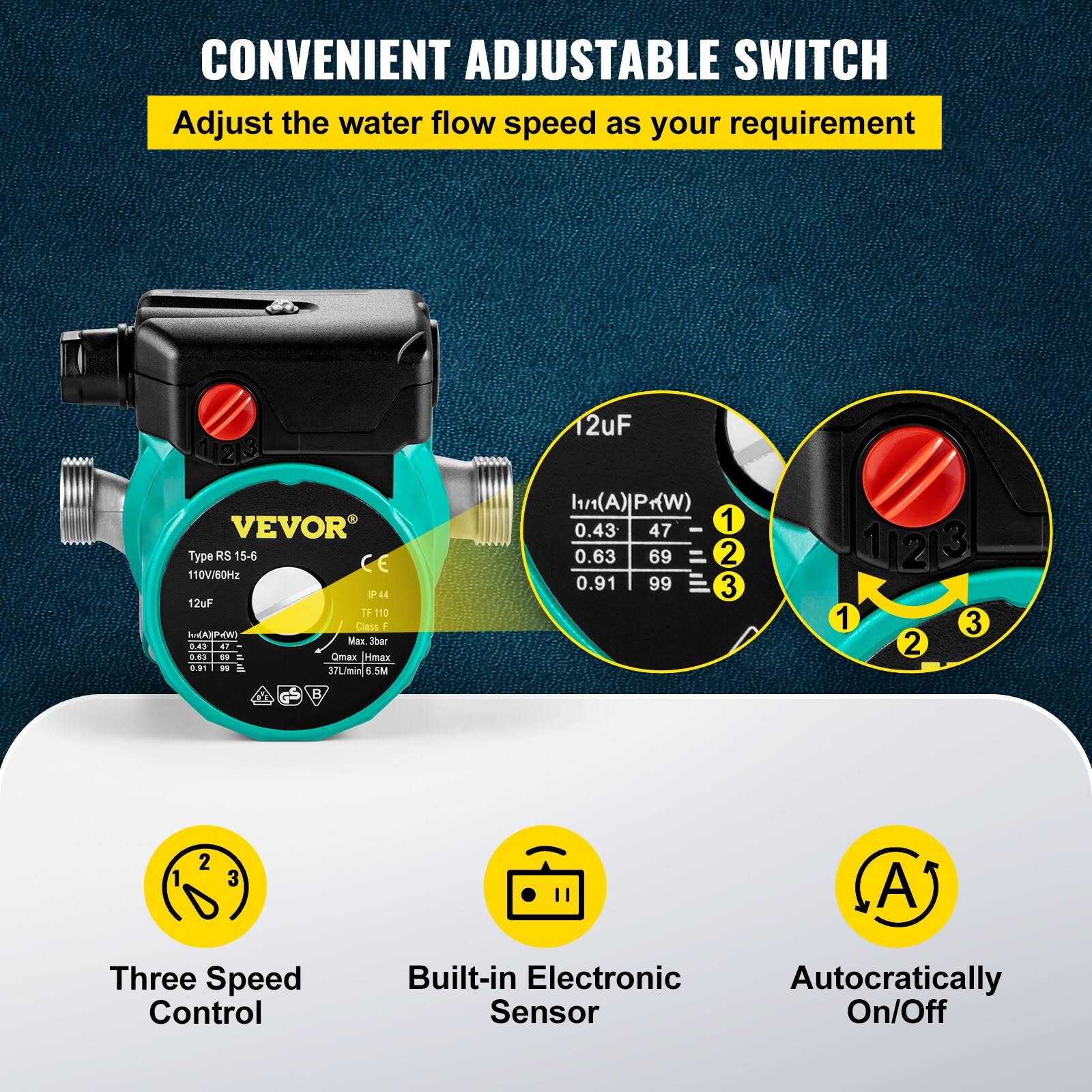 VEVOR Hot Water Recirculating Pump, 93W 110V Water Circulator Pump, Automatic Start Circulating Pump NPT 3/4" w/Brass Fittings, Stainless Steel Head
