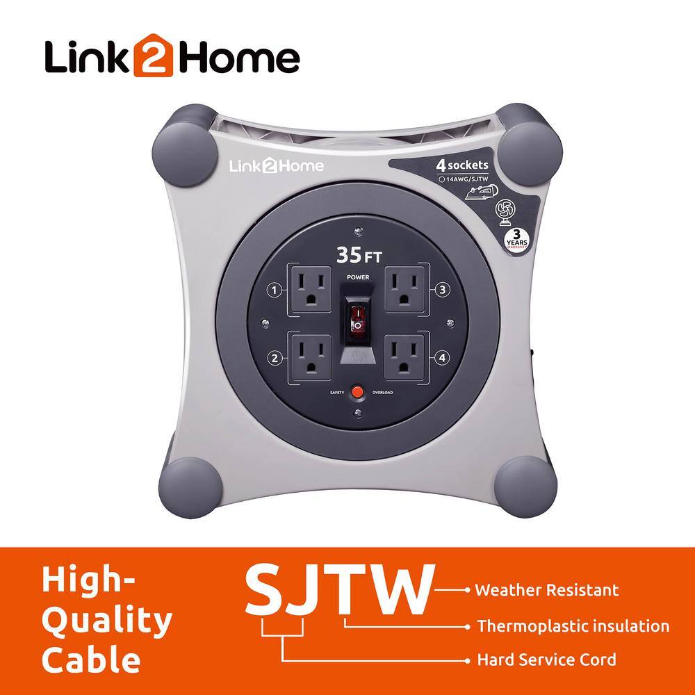 Link2Home EM-EL-350G 35 ft. 14/3 Extension Cord Storage Reel with 4 Grounded Outlets