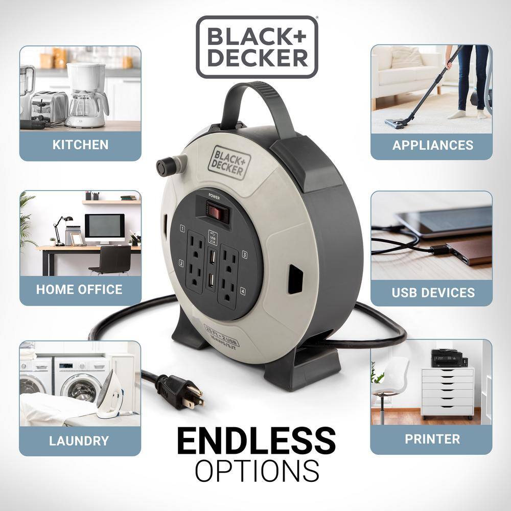 BLACK + DECKER BDXPA0061 25 ft. 4 Outlets and 2 USB Retractable Extension Cord with 16 AWG SJT Cable Compact Power Cord Reel