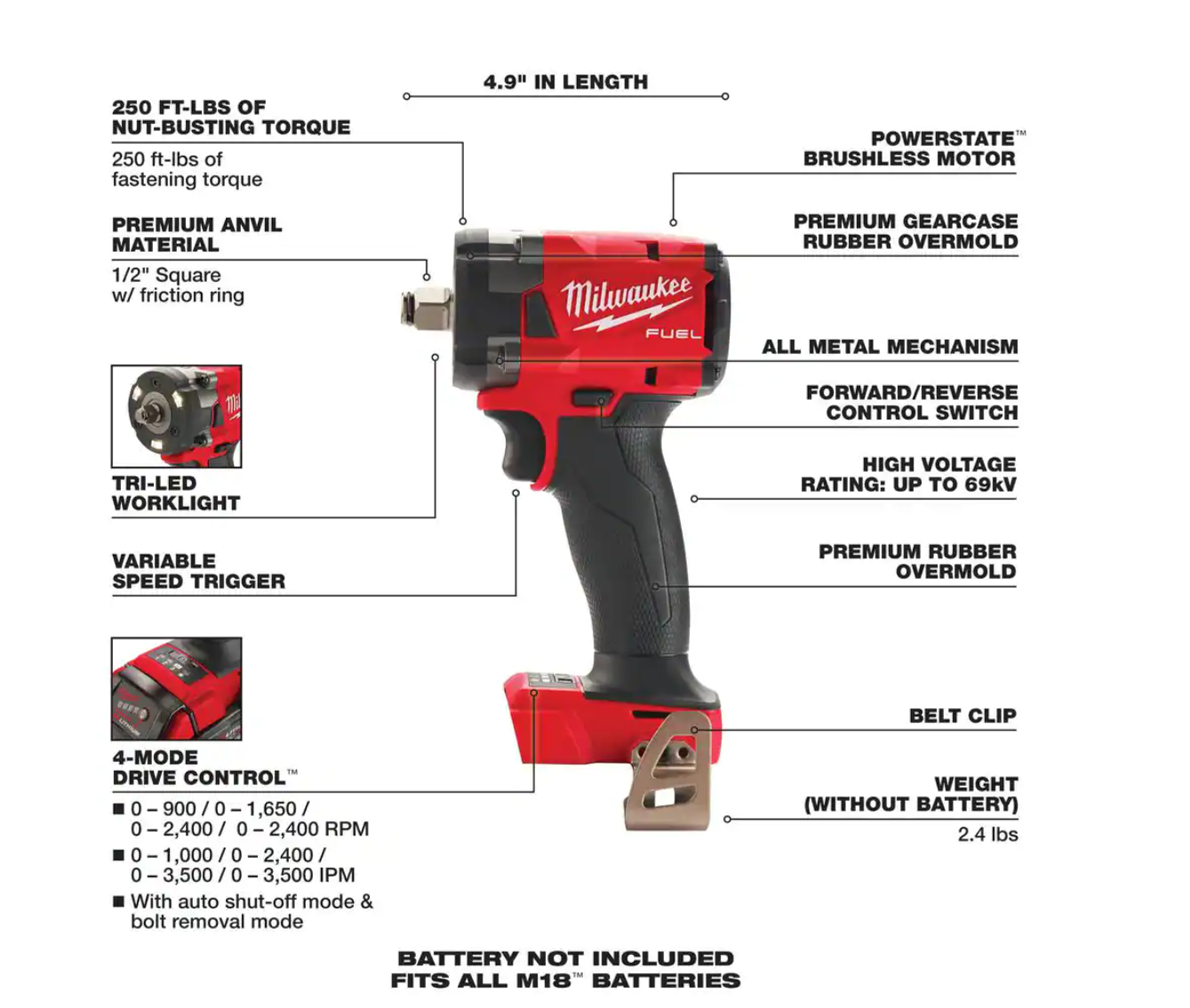 Milwaukee 2767-20-2855-20 M18 FUEL 18V Lithium-Ion Brushless Cordless 1/2 in. Impact Wrench with Compact Impact Wrench (2-Tool)