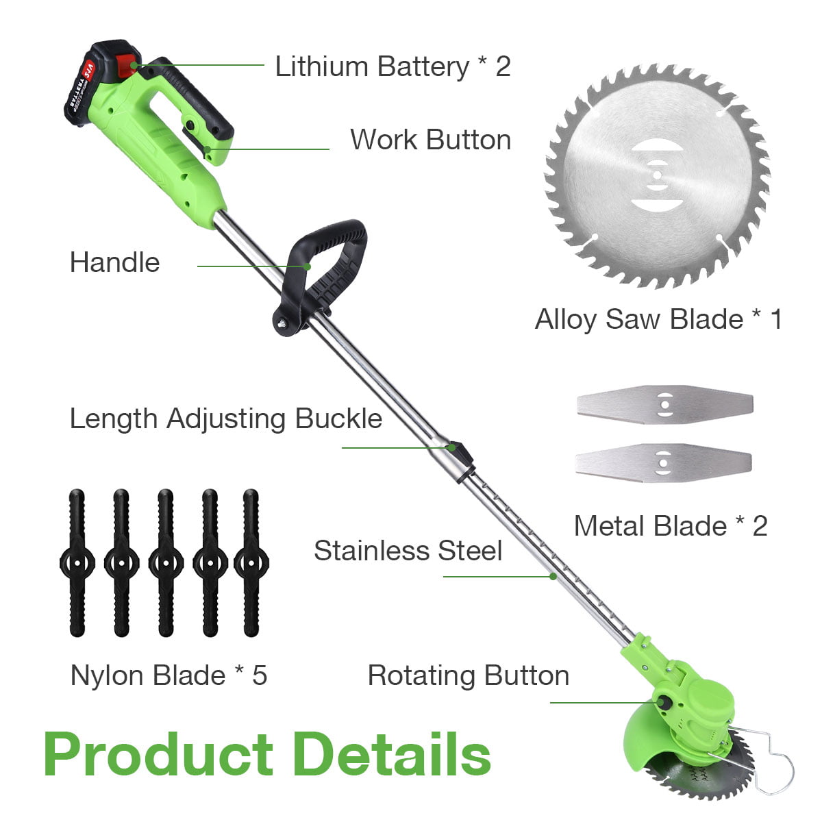 Cordless Grass String Trimmer 21V Electric Weed Enter Lawn Mower Cutter with 2 Batteries for Garden Yard