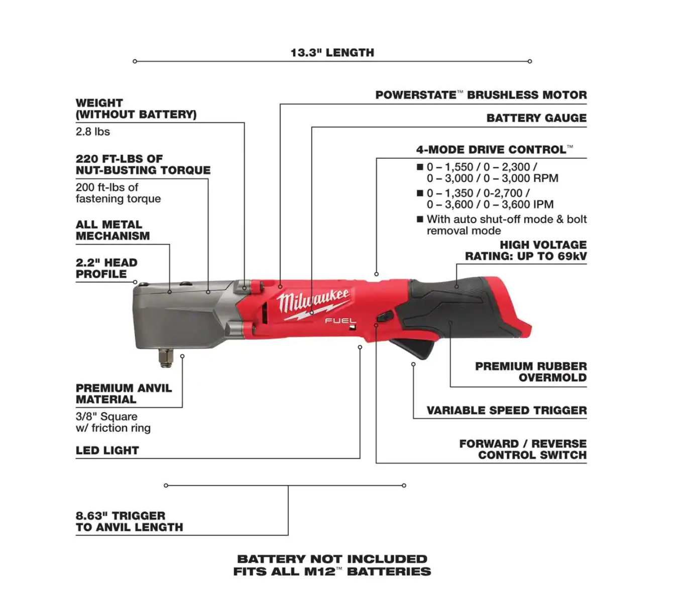 Milwaukee 2564-20-2565-20 M12 FUEL 12V Lithium-Ion Brushless Cordless 3/8 in. and 1/2 in. Right Angle Impact Wrenches Set (2-Tool)