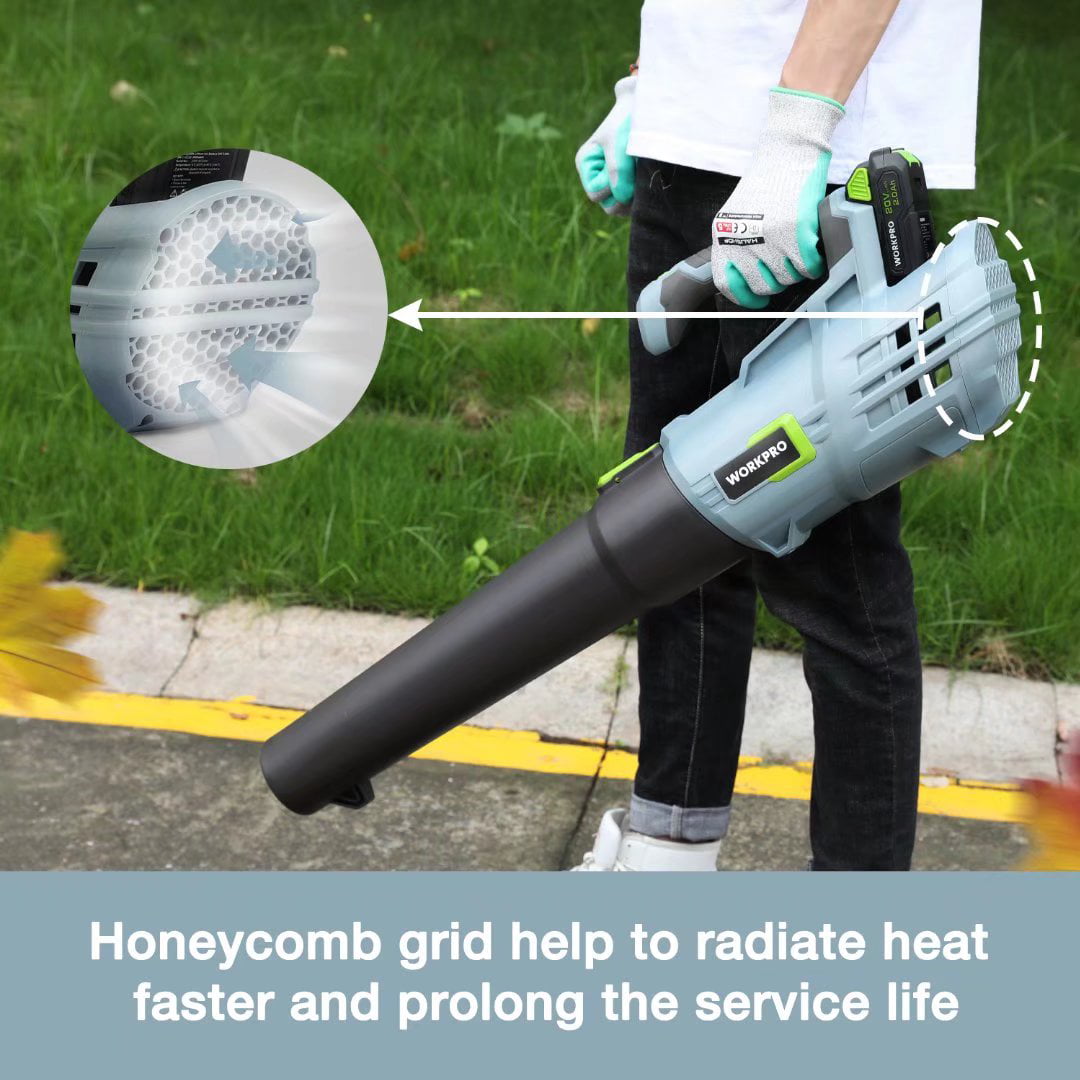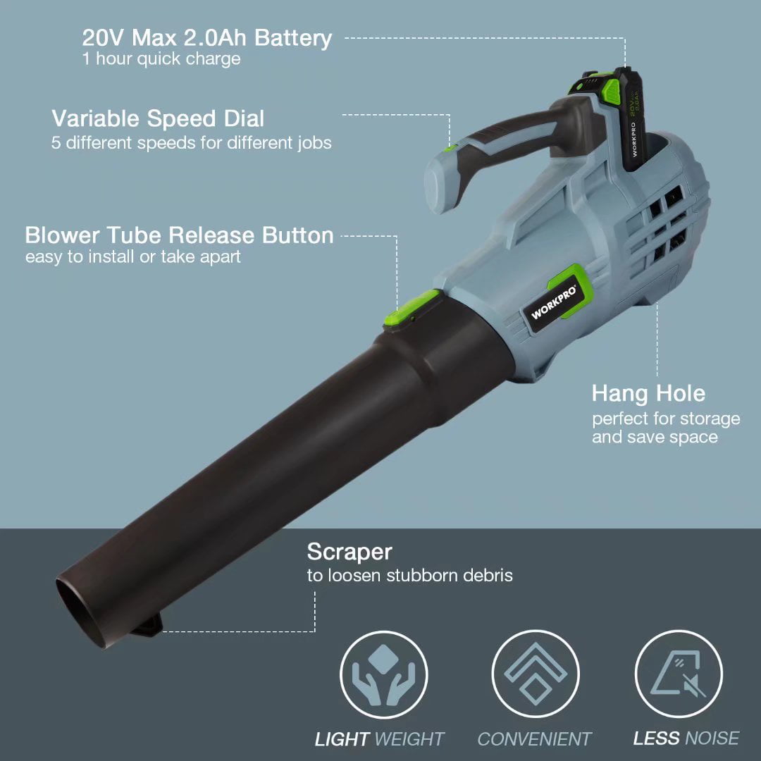 WORKPRO 20V Cordless Leaf Blower. Electric Gardening Tool Powered Sweeper. with 2.0Ah Battery and 1 Hour Quick Charger Included