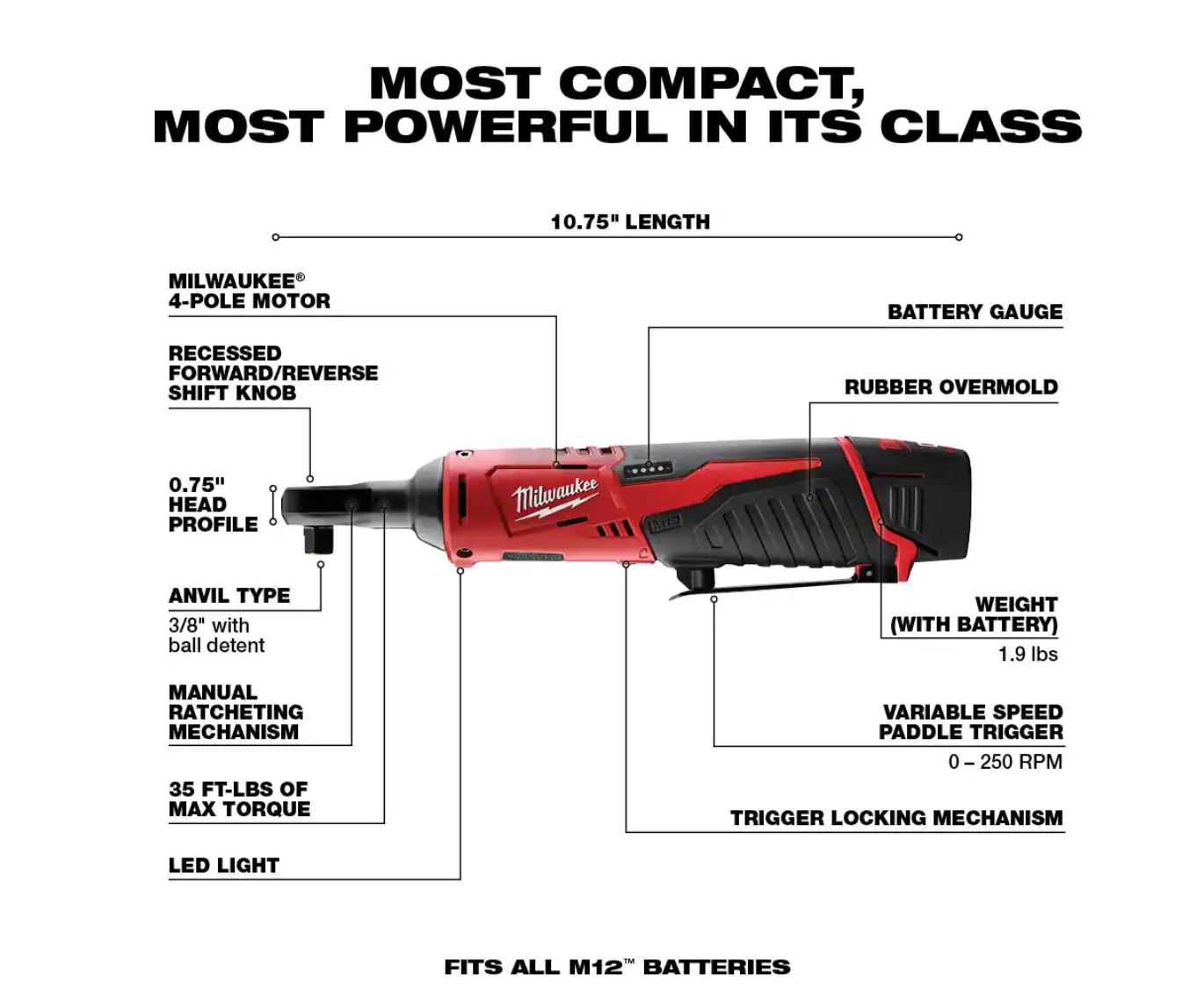 Milwaukee 2457-21 M12 12-Volt Lithium-Ion Cordless 3/8 in. Ratchet Kit with One 1.5 Ah Battery. Charger and Tool Bag