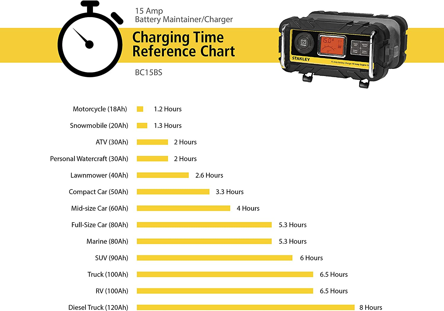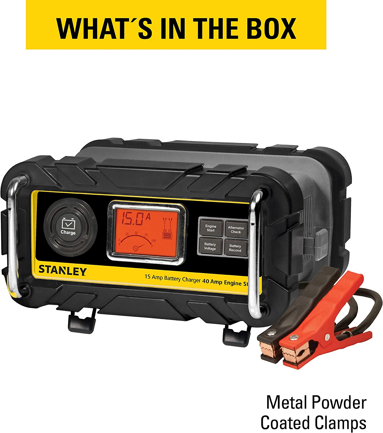 STANLEY BC15BS Fully Automatic 15 Amp 12V Bench Battery Charger/Maintainer with 40A Engine Start. Alternator Check. Cable Clamps