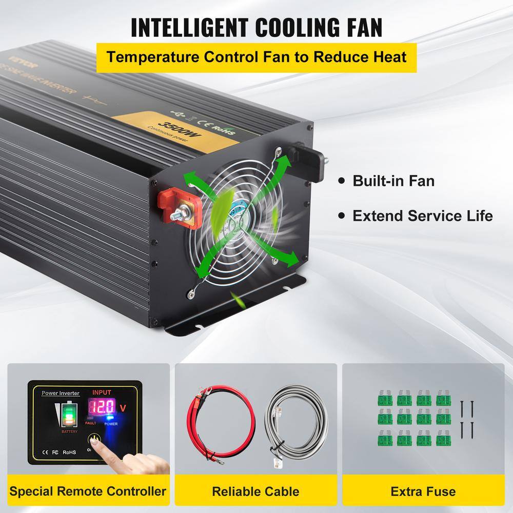 VEVOR CZXNBQDMKWKDD5F35V9 Pure Sine Wave Power Inverter 3500-Watt Car Inverter DC 12-Volt to AC 120-Volt with USB Port LCD Display Remote Control