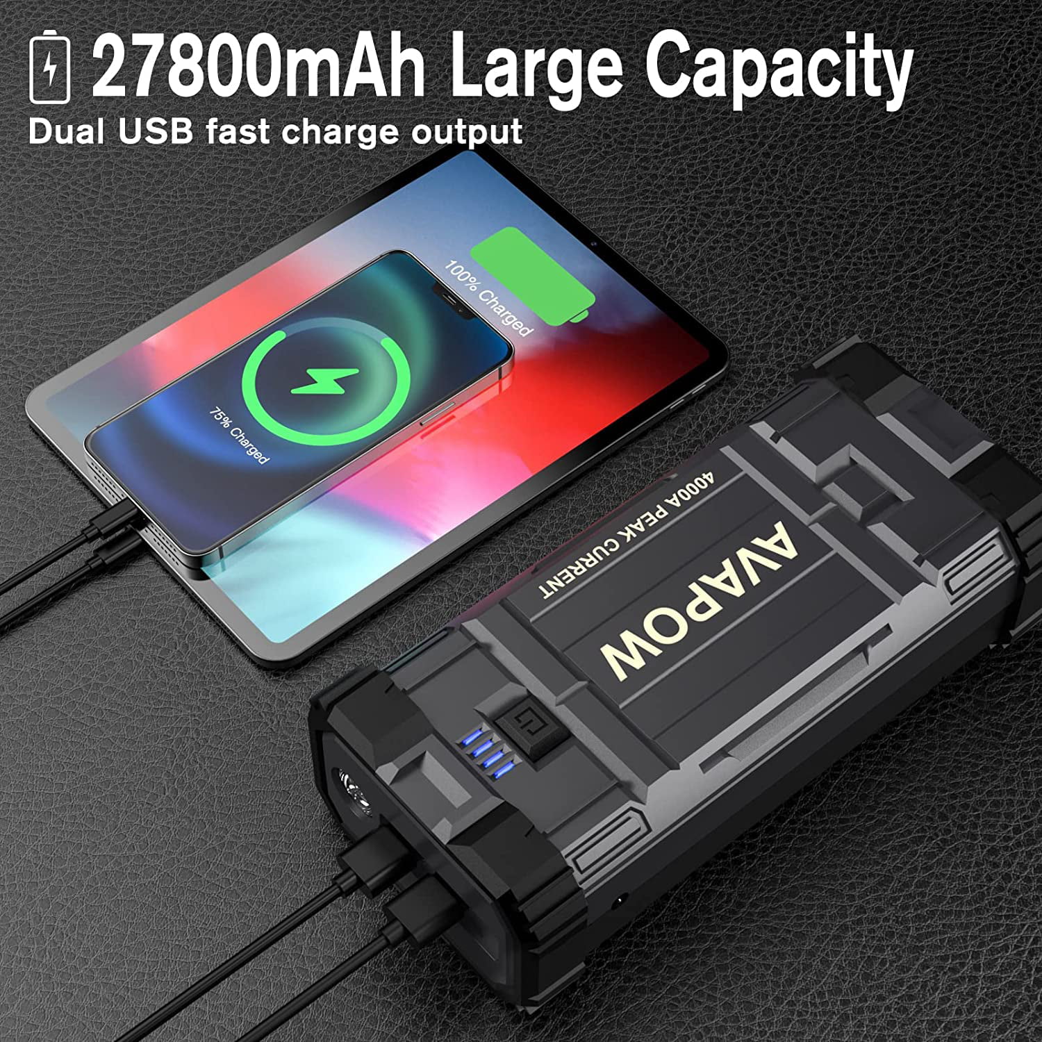 AVAPOW Car Jump Starter. 4000A Peak 27800mAh Battery Jump Starter (for All Gas or Up to 10L Diesel). Battery Booster Power Pack. 12V Auto Jump Box with LED Light. USB Quick Charge 3.0