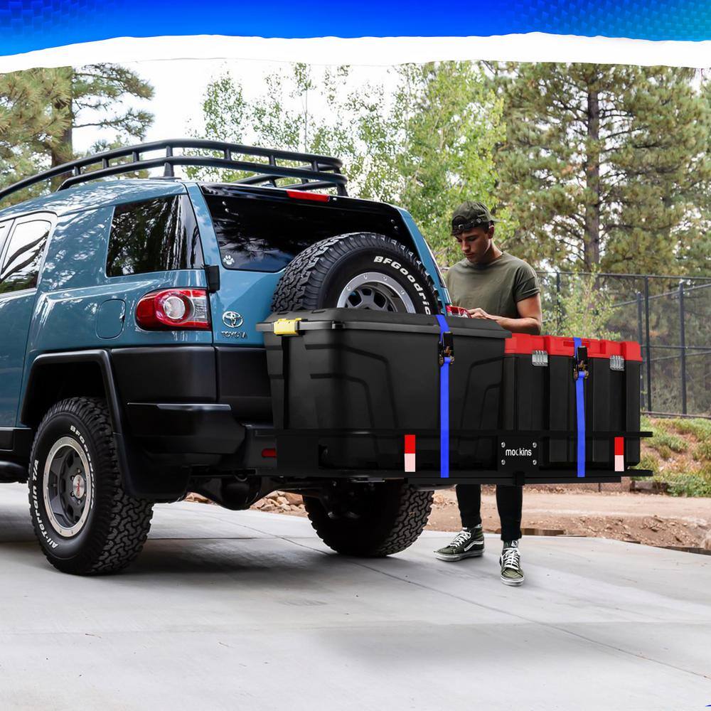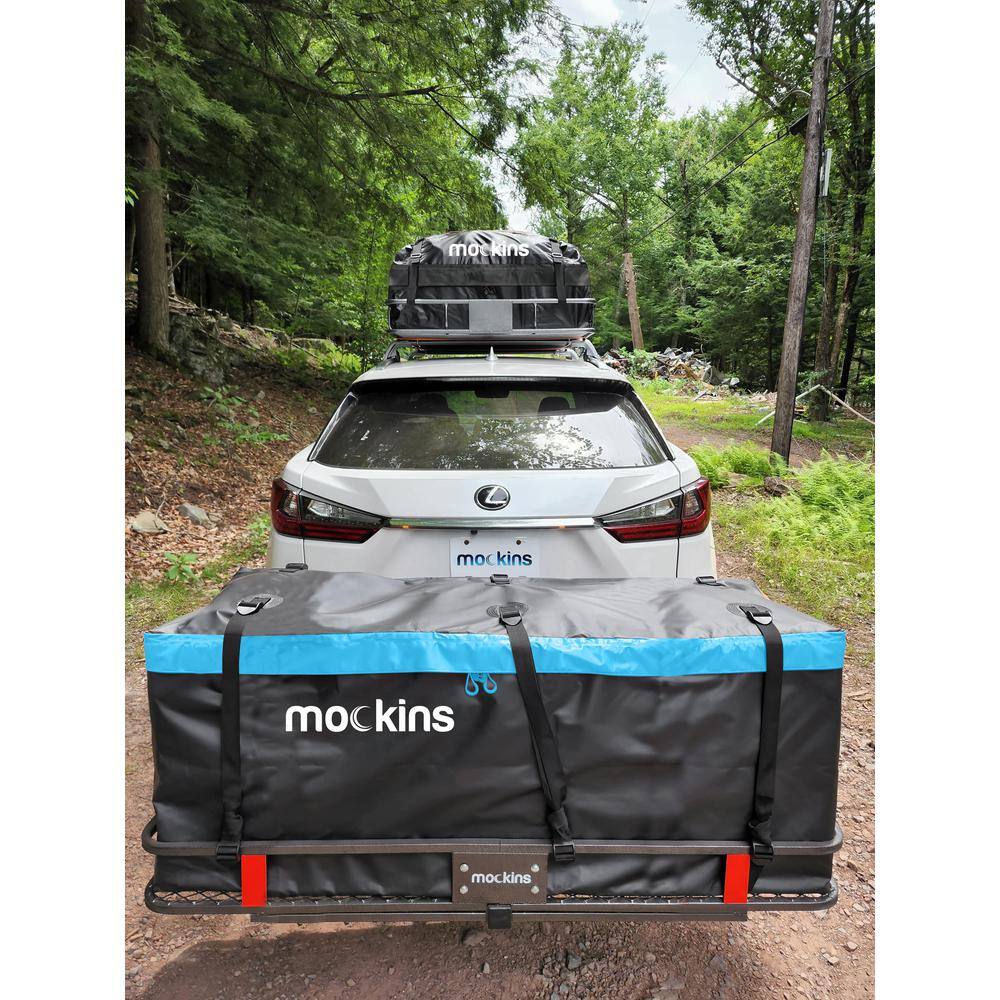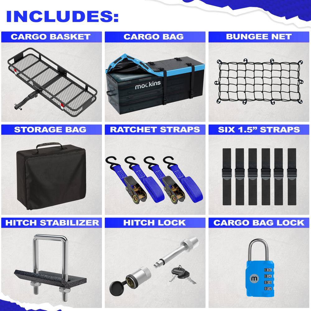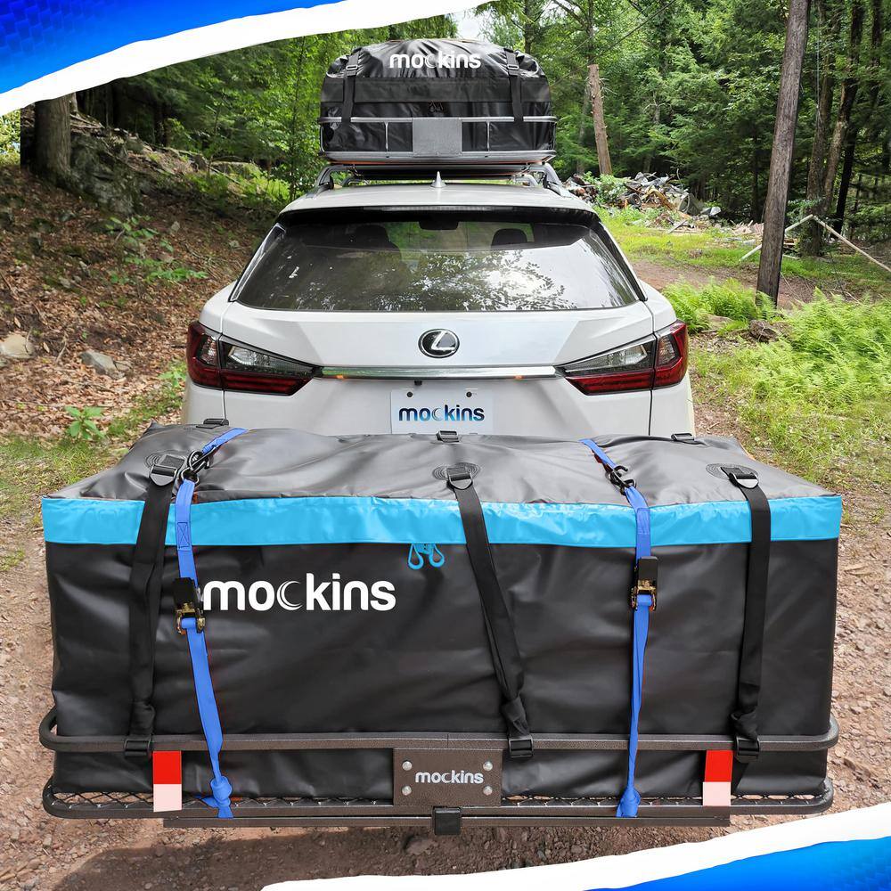 Mockins NA-26 500 lbs. Capacity Hitch Mount Cargo Carrier Set with Folding Shank and 2 in. Raise. Cargo Bag. Net. Straps. Locks - Blue