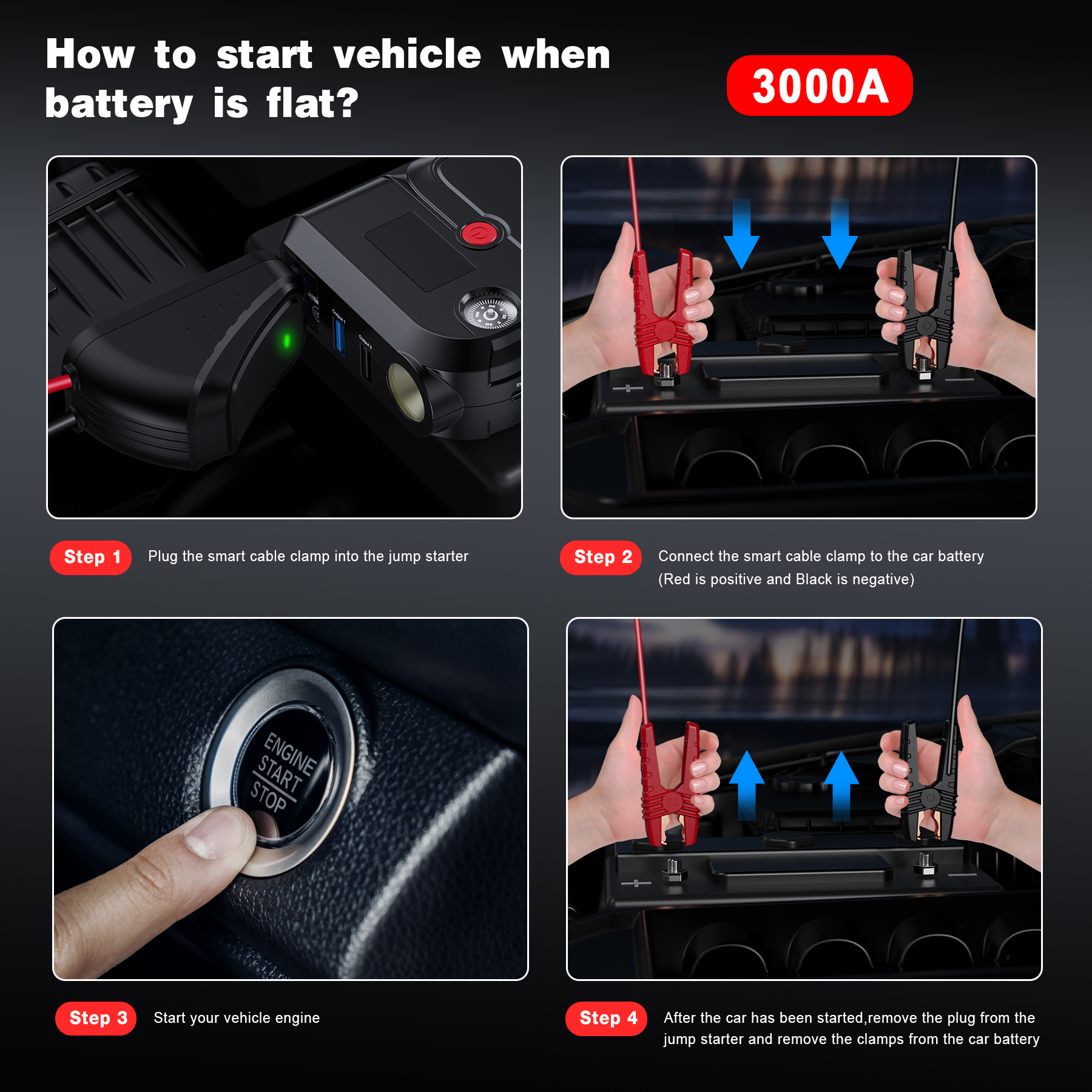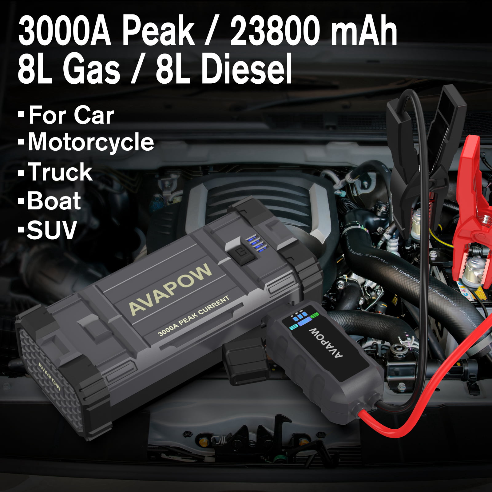 AVAPOW Car Battery Jump Starter 3000A Peak.Portable Jumpstart Starters for Up to 8L Gas 8L Diesel Engine with Booster Function.12V Lithium Jump Charger Pack Box with Smart Safety Clamp