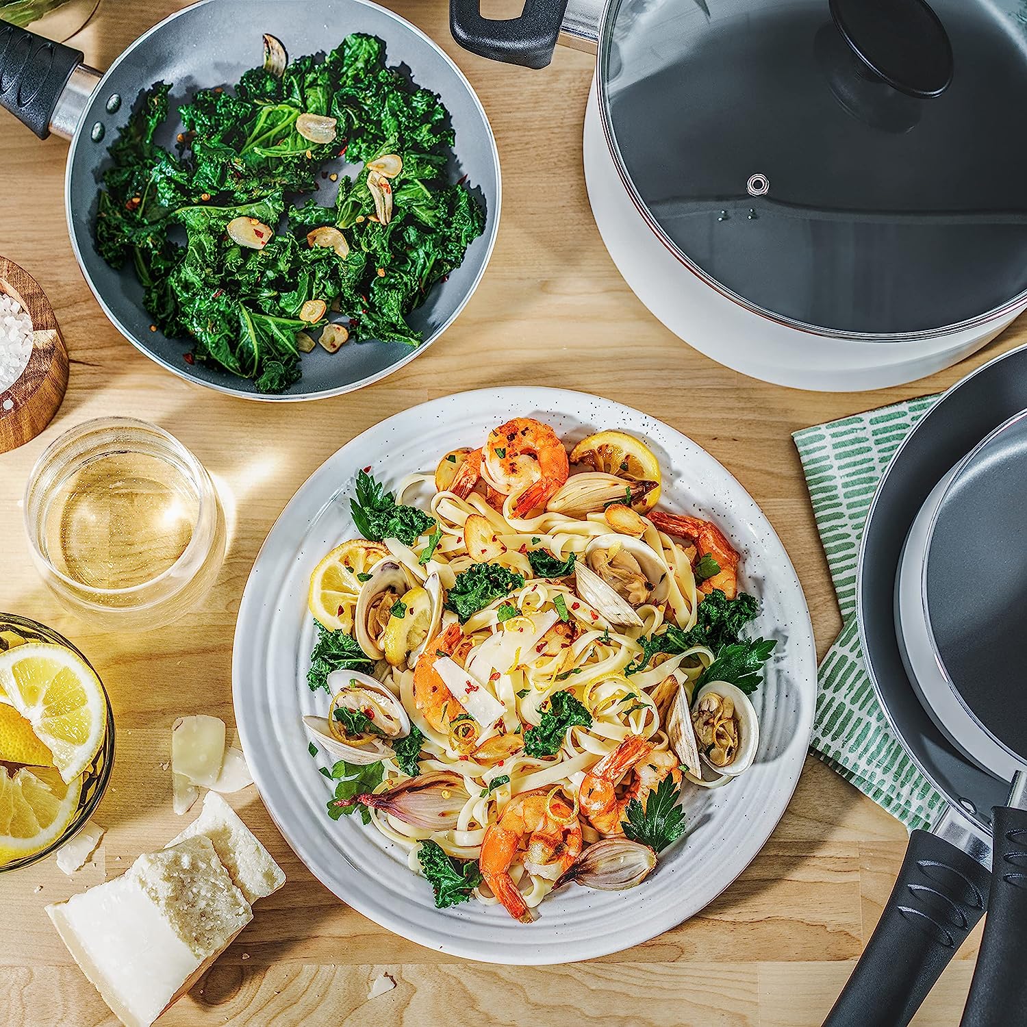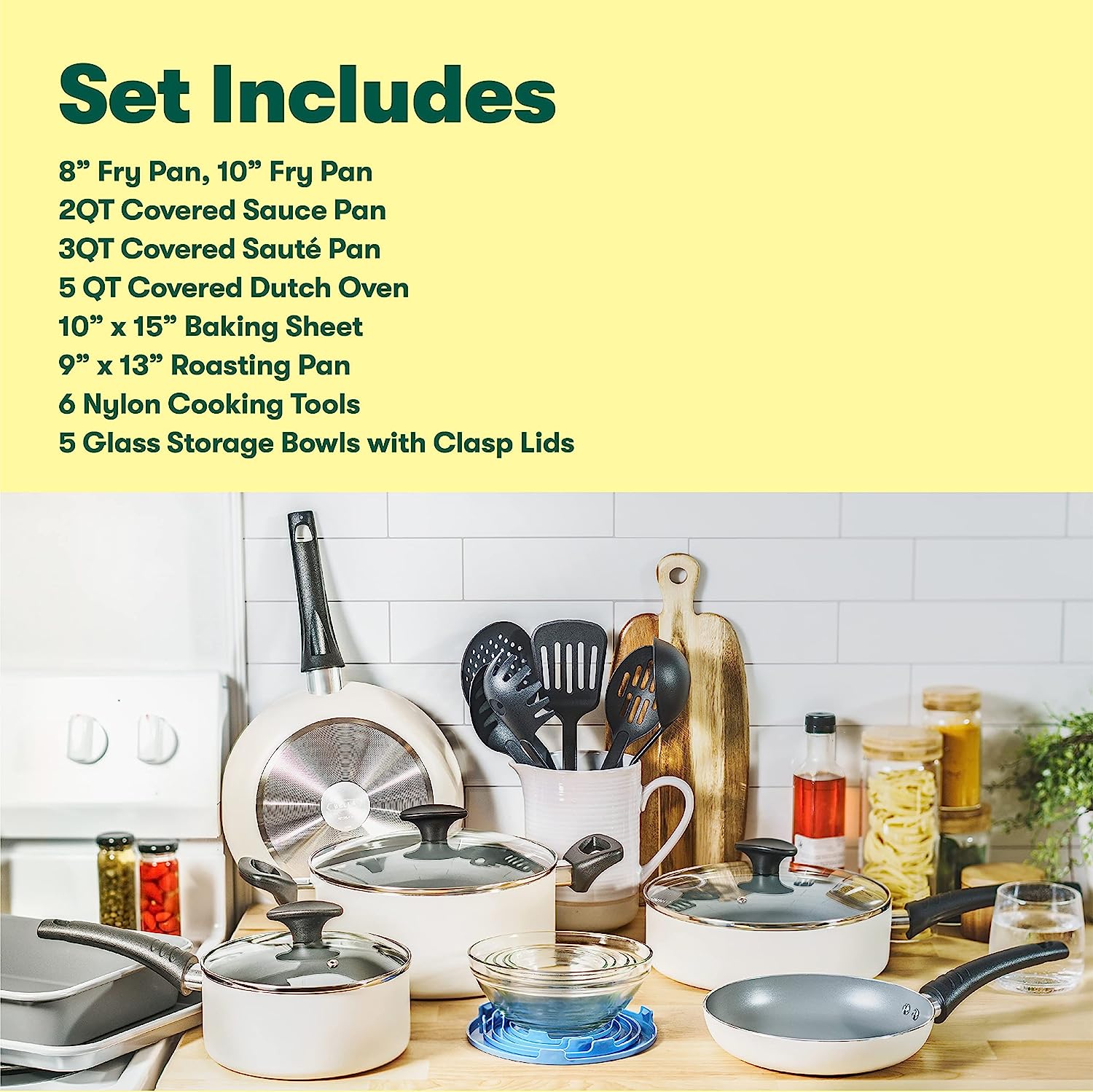 BELLA Nonstick Cookware Set with Glass Lids - Aluminum Bakeware. Pots and Pans. Storage Bowls & Utensils. Compatible with All Stovetops. 21 Piece. White
