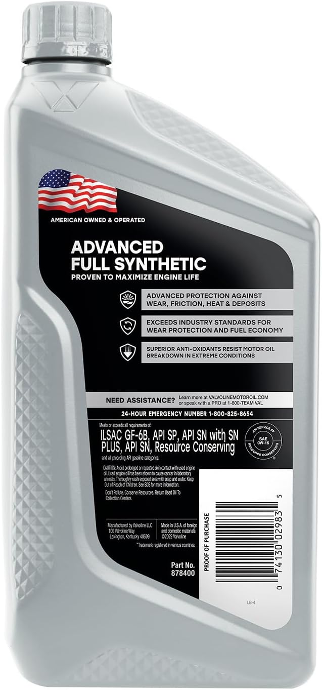 Valvoline Advanced Full Synthetic SAE 0W-16 Motor Oil 1 QT. Case of 6