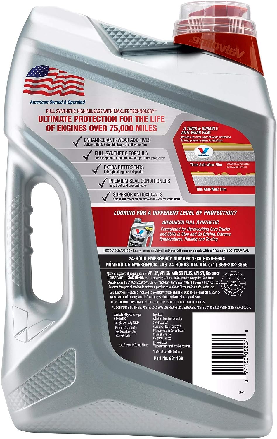 Valvoline Full Synthetic High Mileage with MaxLife Technology SAE 0W-20 Motor Oil 5 QT. Case of 3