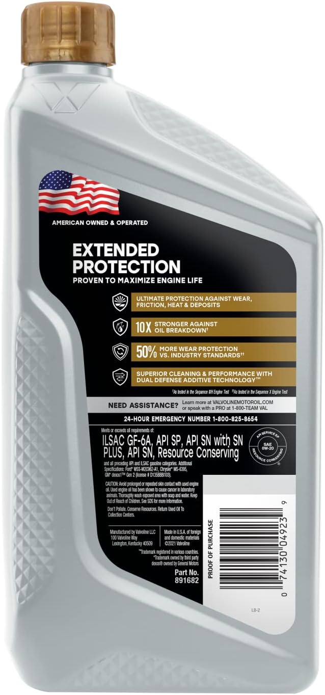 Valvoline Extended Protection SAE Full Synthetic Motor Oil SAE 0W-20 1 QT. Case of 6