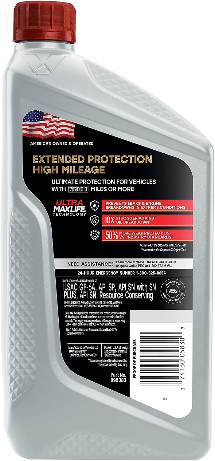 Valvoline Extended Protection High Mileage with Ultra MaxLife Technology 5W-30 Full Synthetic Motor Oil 1 QT. Case of 6