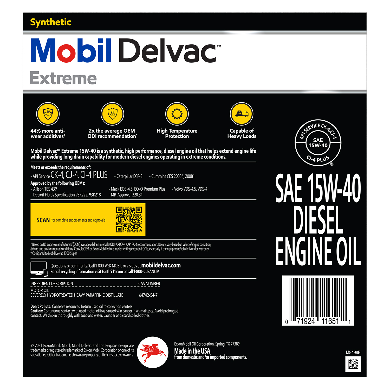 Mobil Delvac Extreme Heavy Duty Full Synthetic Diesel Engine Oil 15W-40. 2.5 gal