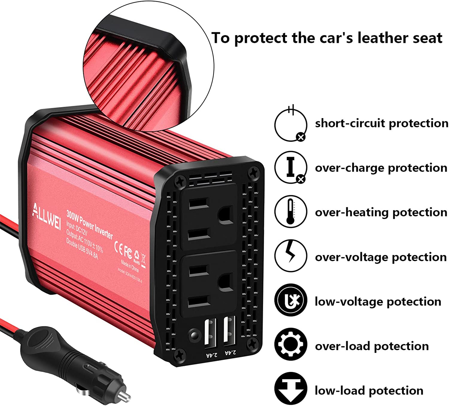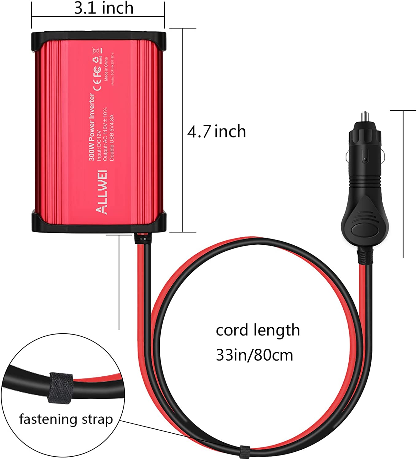 ALLWEI 300W Power Inverter Car DC 12V to 110V AC Converter 4.8A Dual USB Charging Ports Car Charger Adapter (Red)