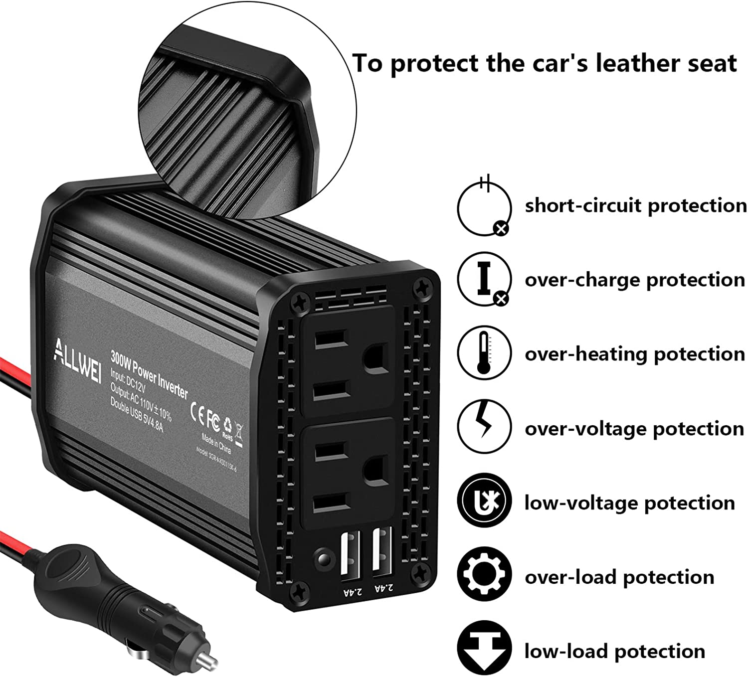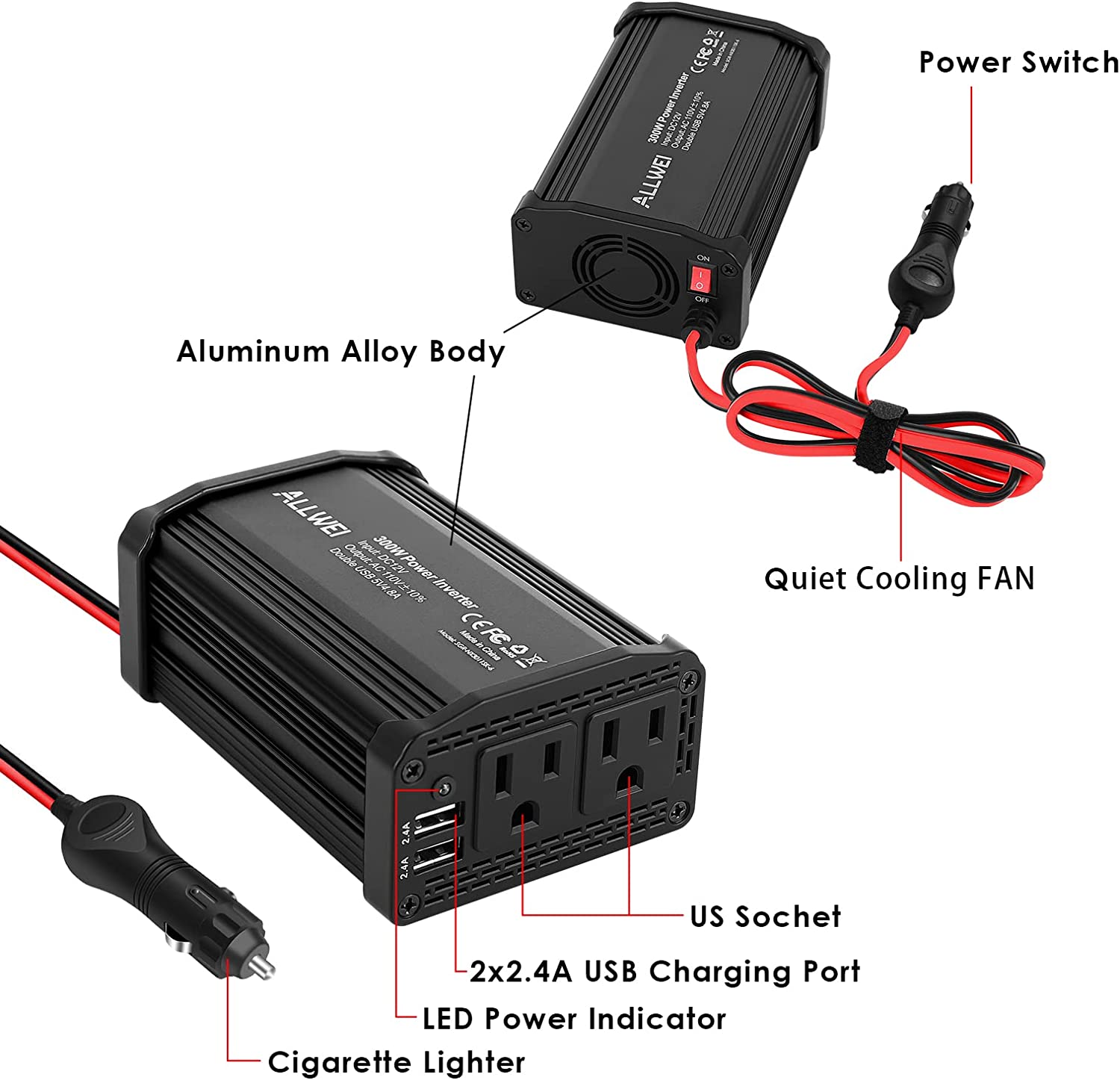 ALLWEI 300W Power Inverter Car DC 12V to 110V AC Converter 4.8A Dual USB Charging Ports Car Charger Adapter (Black)