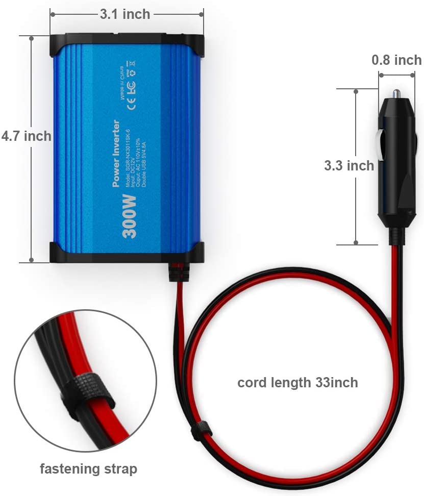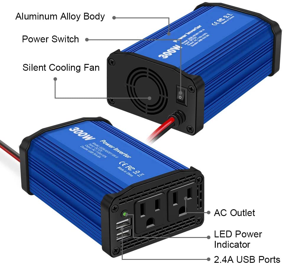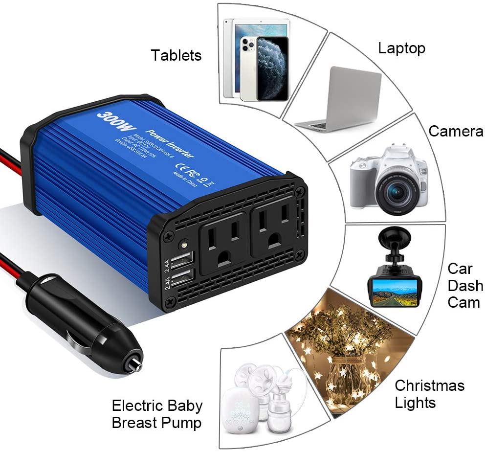 GelooWork 300W Power Inverter DC 12V to 110V AC Car Charger Converter with 4.8A Dual USB Ports (Blue)