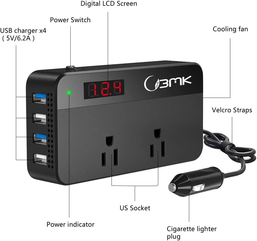 BMK 200W Car Power Inverter DC 12V to 110V AC Car Inverter 4 USB Ports Charger Adapter Car Plug Converter with Switch and Current LCD Screen